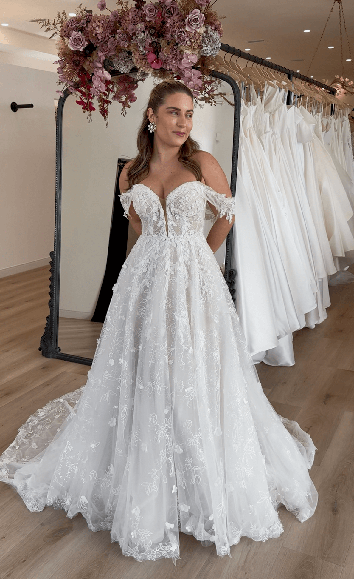 1321 is an exquisite and ethereal A-line gown. This wedding dress features several decadent details, from fluttering floral embellishments to voluminous, flowing tulle. The sweetheart neckline bodice is covered with layers of floral lace details, with sheer elements showing off the intricate details. Sexy exposed boning peeks through the chantilly lace for a demure, high-fashion look. All through the skirt, breezy 3D floral appliques add dimension and texture to this A-line gown. The off-the-shoulder strap adds a final whimsical touch, with the 3D appliques giving this couture gown a complete, cohesive feel.