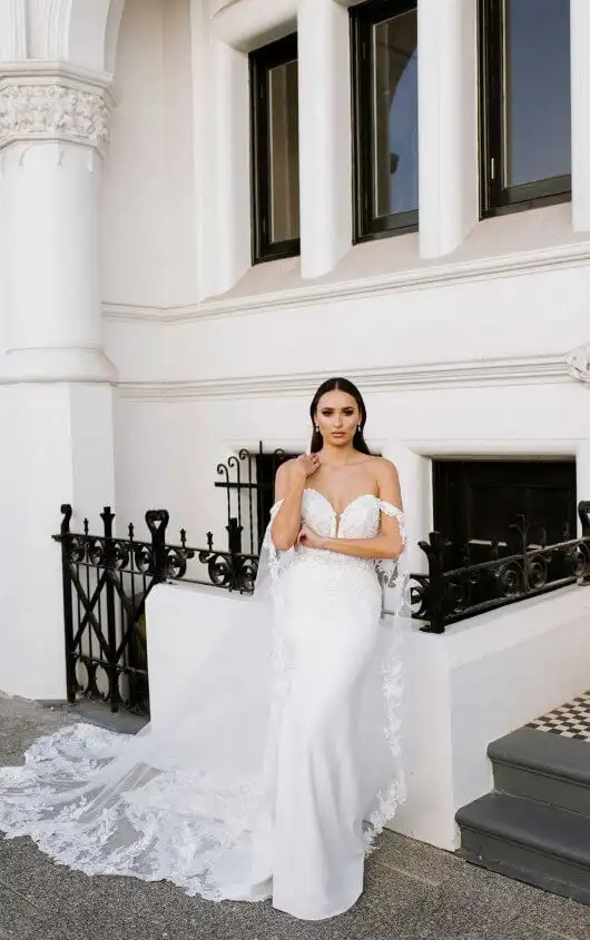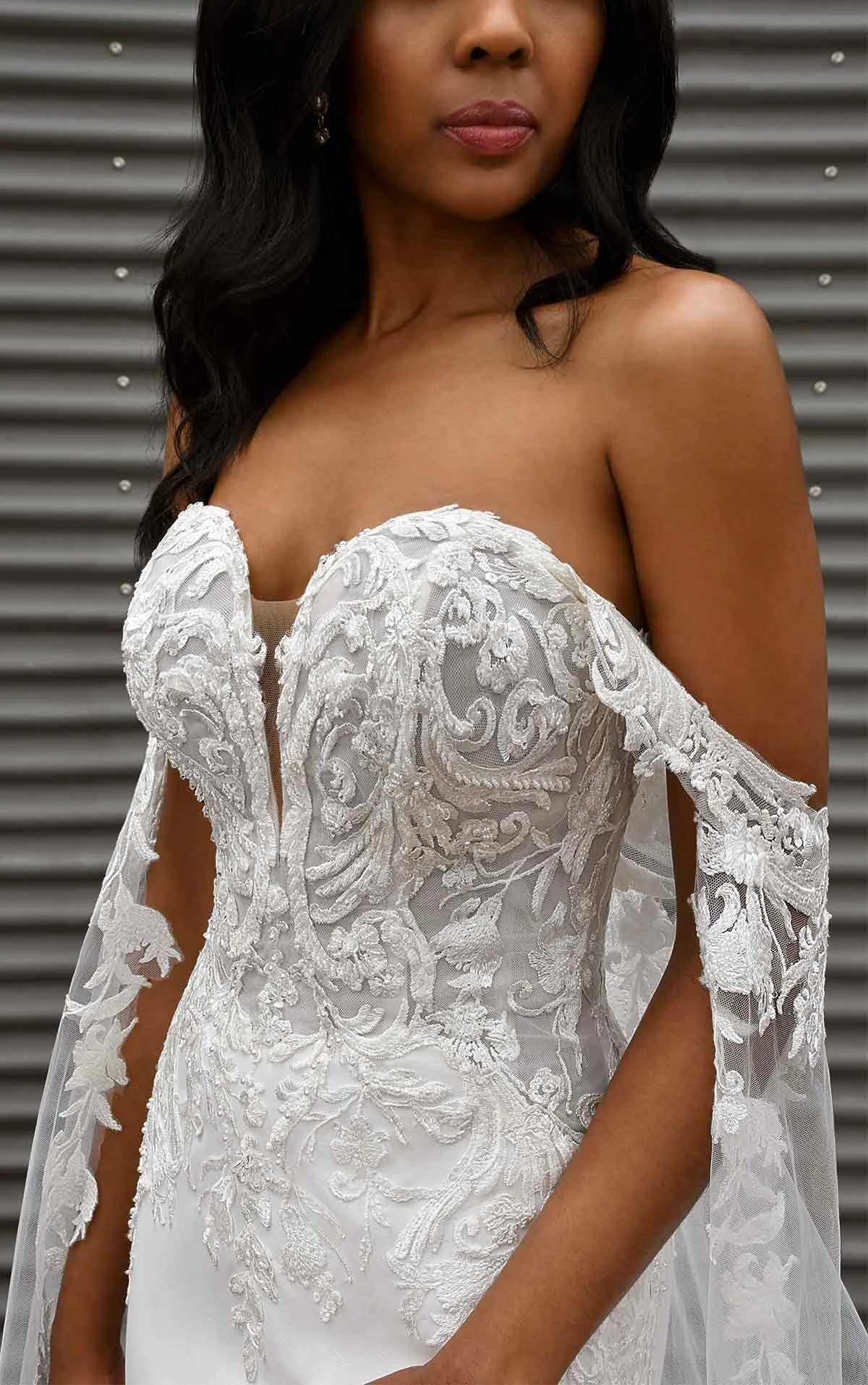 1362 has a classic sheath silhouette, this wedding dress features intricate lace patterns and top-quality fabrics to create a stunning bridal look. Swirling lace decorates the bodice while beautifully sculpting the bustline, with a plunging neckline and sheer elements for a stunning touch. The sleek crepe fabric in the skirt contours effortlessly to the body’s natural curves, leading to a train adorned in lace appliques with a scalloped hem. The detachable train connects at the back for an ethereal flourish, bringing the dreamy drama to this couture bridal look. Please note, store sample does not have cape attachment.