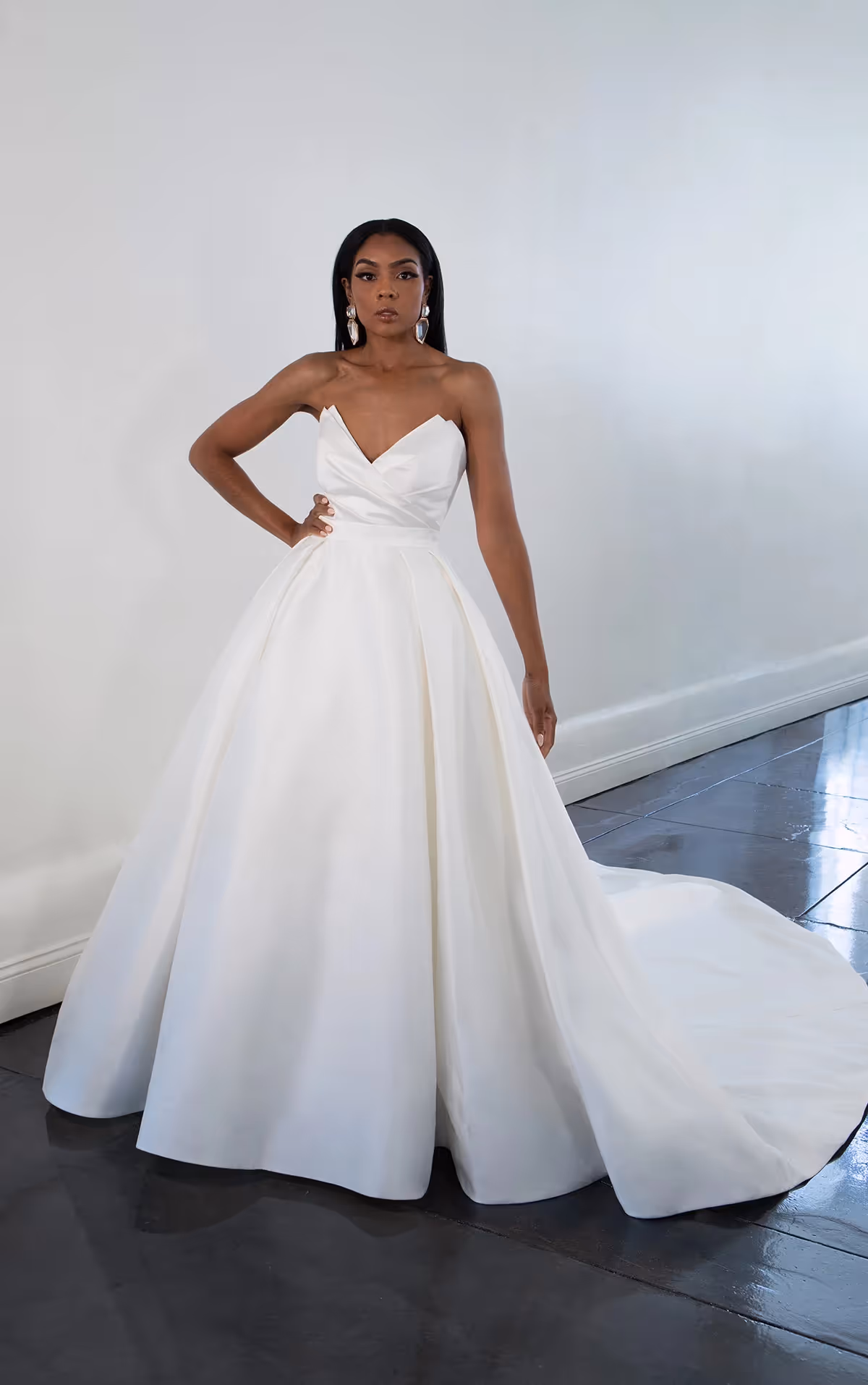 557 takes timeless bridal design and adds a luxurious, glamorous twist. This show-stopping wedding gown is constructed in sumptuous ivory silk zibeline. It features a one-of-a-kind two-piece silhouette: a fitted fit-and-flare underdress and a gorgeous ballgown and overskirt. The underdress features a strapless bodice with architectural accents and a wrapped silk effect. When paired with the dramatic cathedral train on the over skirt completes this striking gown for an elevated, elegant appeal. The overskirt cuts a striking regal silhouette and when removed reveals the underdress, with its softly flared hem and demure split. This versatile option provides two sophisticated and memorable looks in one.