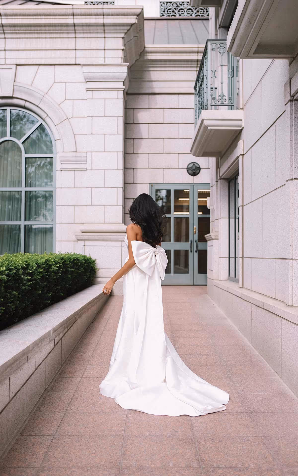 1565 elevates clean and simple design to pure glamour with its sleek, modern luxe look. This silk Zibeline wedding dress starts with a pleated strapless bodice, straight across neckline and tailored bodice that meets a row of fabric-covered buttons in the center back, where there’s a chic oversized detachable bow detail. From the waist, luminous silk Zibeline glides over the body’s contours, accentuating the figure before flaring into an elegant sweeping train. For a look that’s a modern classic, this glamorous gown has all the features of a timeless wedding gown.