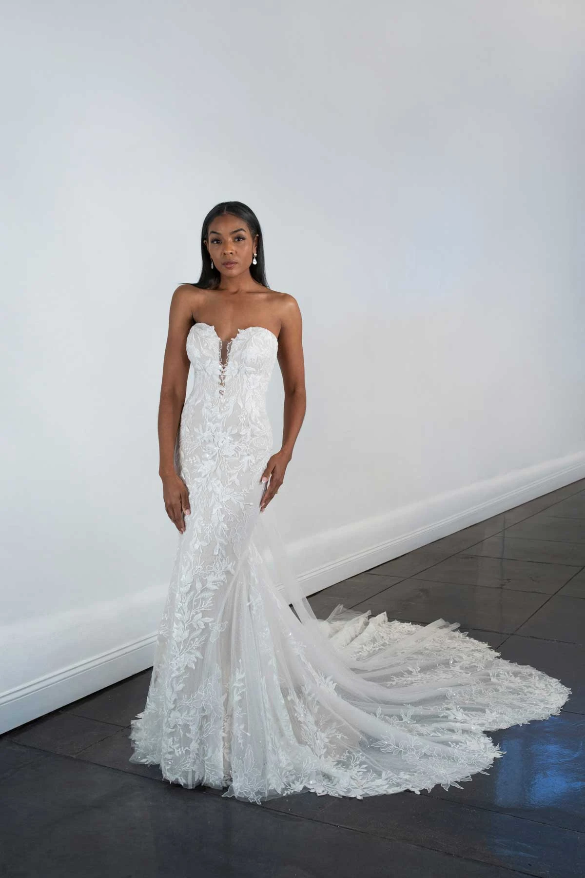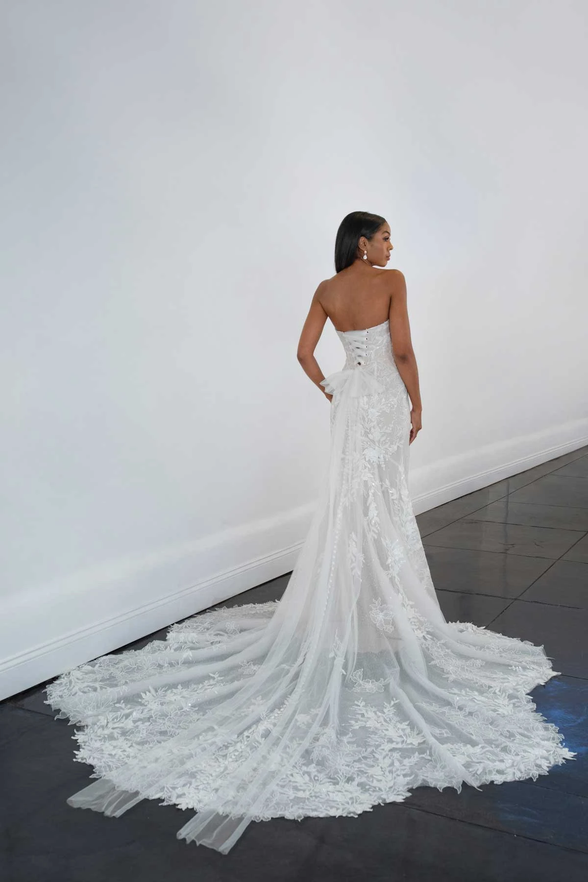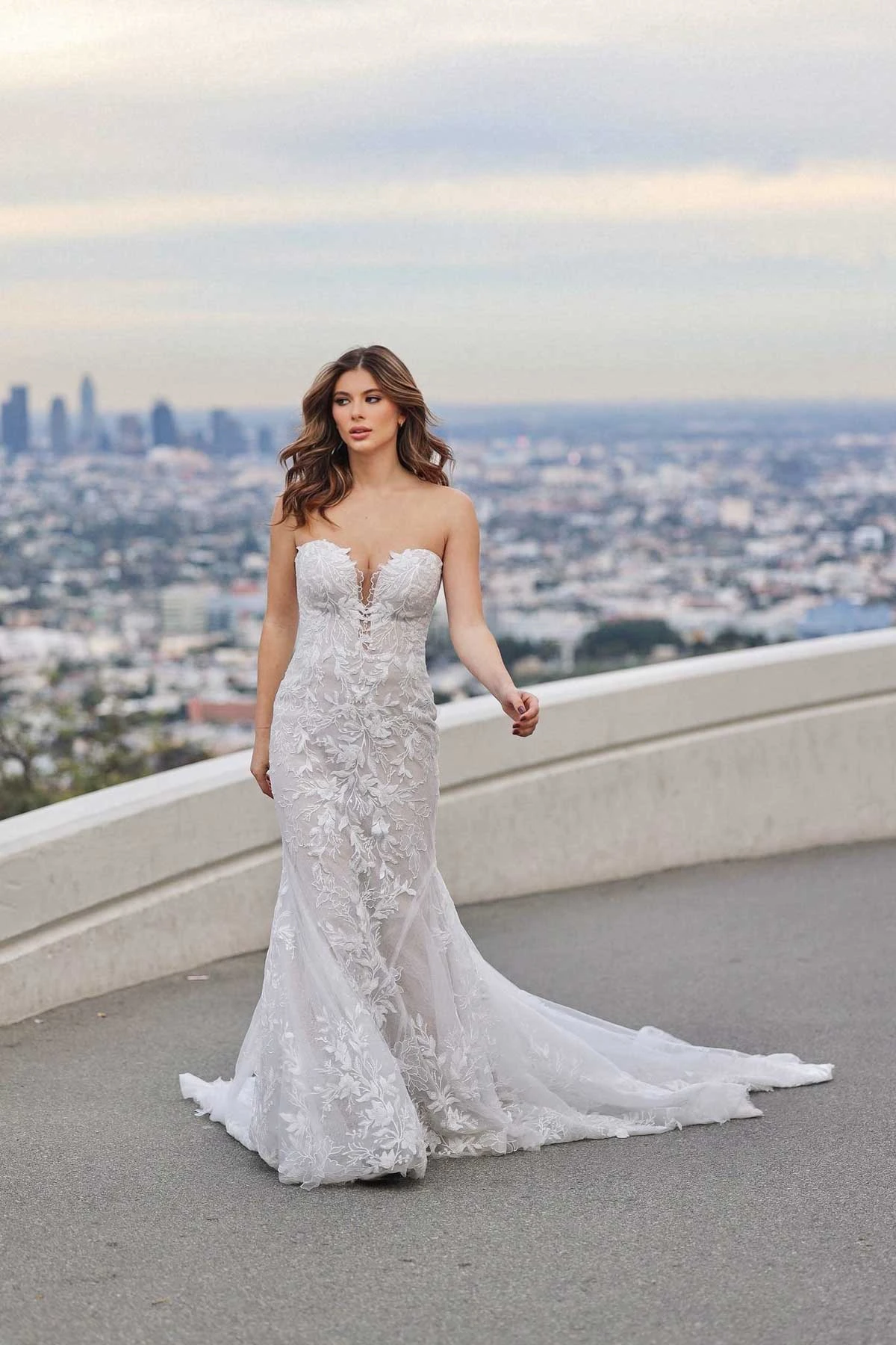 1620 brings a subtle romantic sexiness to that special day with its designer construction and couture details. The lace-outlined strapless bodice features a plunging sweetheart neckline that dips near the waist and wraps into a corset-style tie-back detail. Contour seaming and impeccable tailoring outline the figure and highlight the unique textured leaf-style lace throughout. At the knee, the soft fit-and-flare silhouette expands into a textured tulle skirt and shaped train for a glamorous finishing touch.