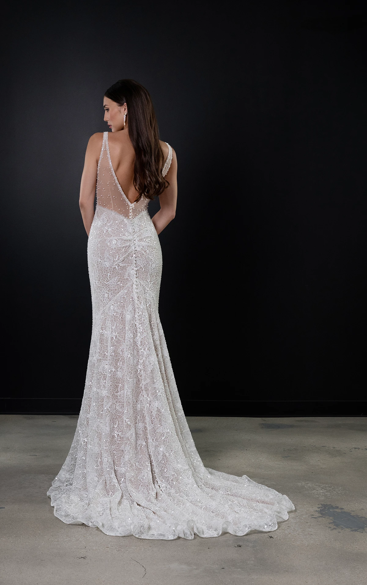 A striking column silhouette adorned in sparkling embellished lace catches every ray of light down the aisle. 1697 features elegant spaghetti straps that suspend from a gently scooped neckline, effortlessly draped across the bust to highlight the figure. Sultry side cutouts join a gorgeously low illusion pearl-adorned back detail that introduces the soft ruched hip of the fitted sheath skirt. Exuding sophistication and glamour with every movement, this sexy column wedding gown is a true showstopper.