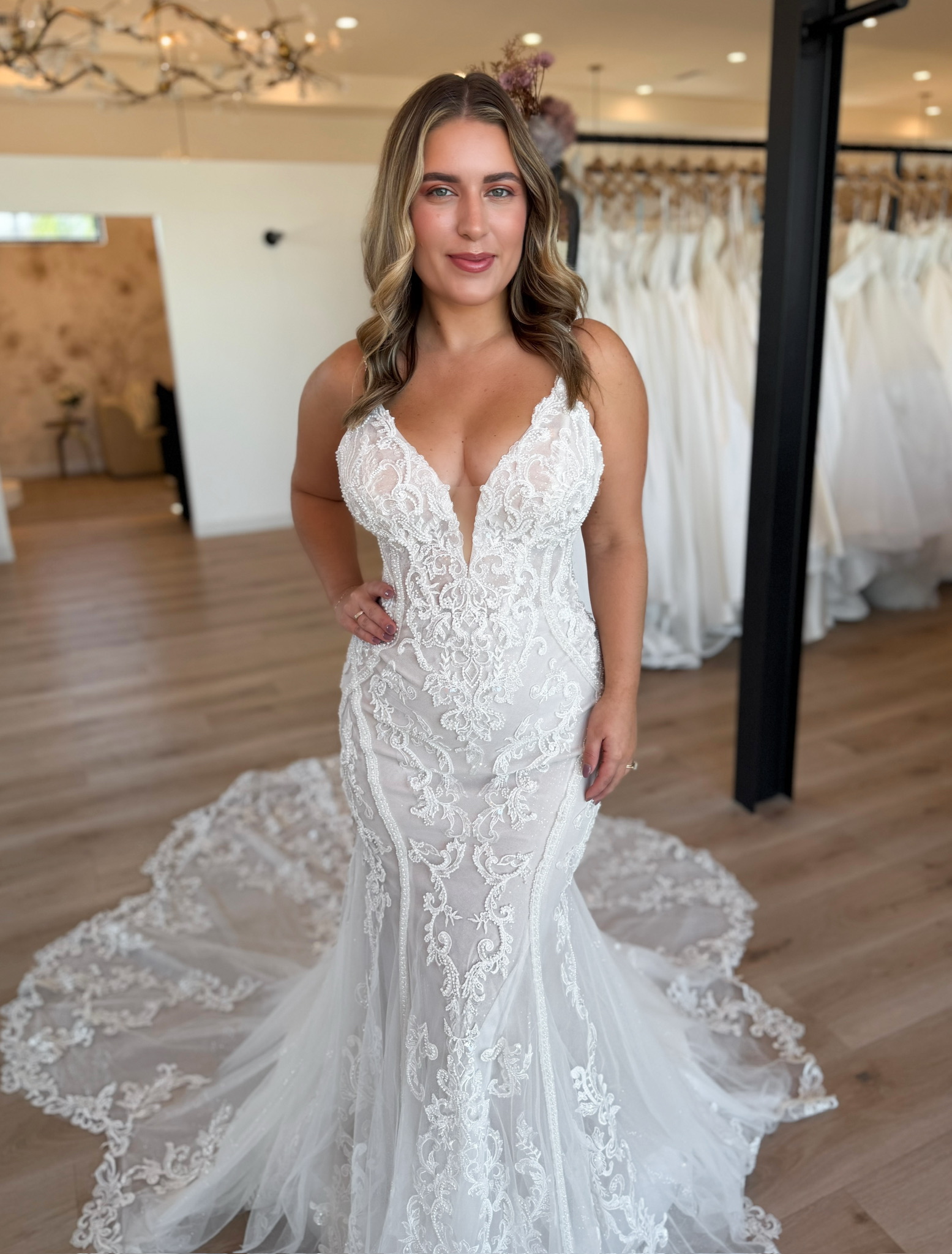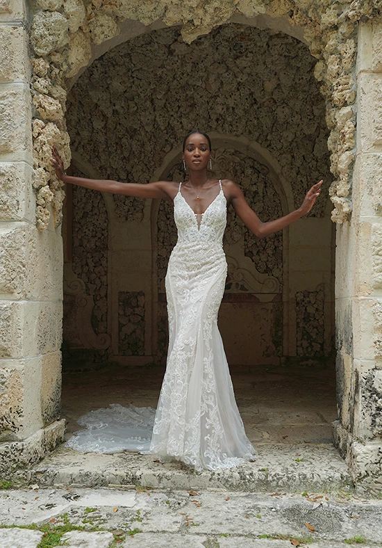 1713 is a sexy graphic lace fit-and-flare wedding gown that features glimmering sleek spaghetti straps that connect to a stunning plunging V-neckline lined with illusion tulle. The graphic pearl-adorned lace appliqué scrolls throughout the fitted bodice and skirt, with an intricate baroque lace pattern. A glamorous low back detail meets a small row of fabric-covered buttons in the back that introduce a captivating shaped cutout lace train.