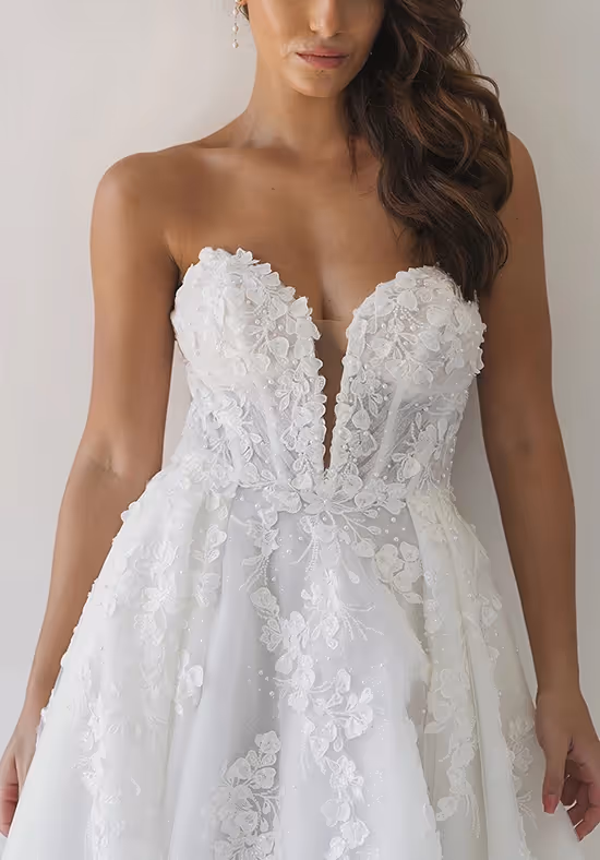 1715 is a floral lace A-line wedding dress with stunning fashion-forward details. A strapless sweetheart neckline plunges over a bodice lavished in 3D floral and pearl-adorned lace appliques. A gorgeous illusion open back detail is framed in lace with timeless fabric-covered buttons that trail to the hem of the train. From the waist, soft pleats open into a full A-line skirt adorned with scattered tendrils of lace appliques. Feel utterly romantic and sophisticated gliding down the aisle in this romantic A-line wedding dress.