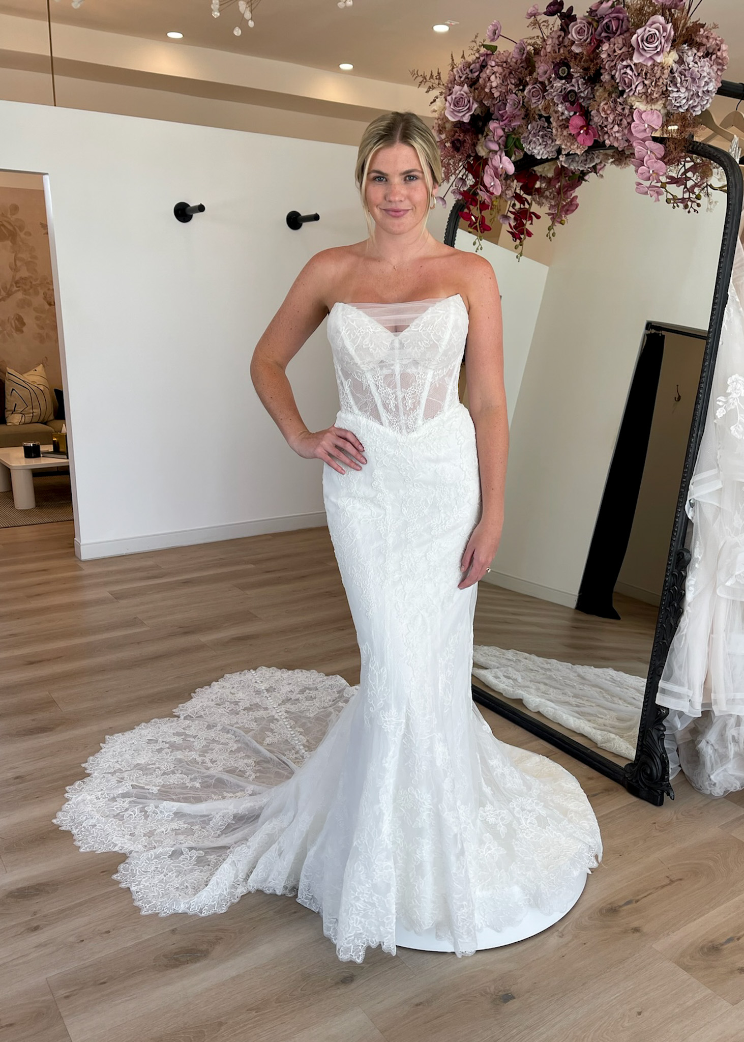 1752 is a sexy lace wedding dress with a fashion-forward twist. Detachable off-the-shoulder long lace sleeves complement the sheer strapless bodice, revealing a sweetheart neckline enveloped in a layer of gauzy gathered tulle. Subtle corset boning peeks through the delicate floral lace, accentuating the bodice’s tailored lines before meeting the shaping seams of the flattering fit-and-flare skirt to showcase the natural hourglass silhouette. Lace-covered buttons trail down the back, leading to a frothy lace-trimmed shaped train that glides gracefully down the aisle. This romantic detachable long-sleeved lace wedding gown makes a breathtaking statement from every angle for an elegant blend of timeless romance and contemporary chic.
