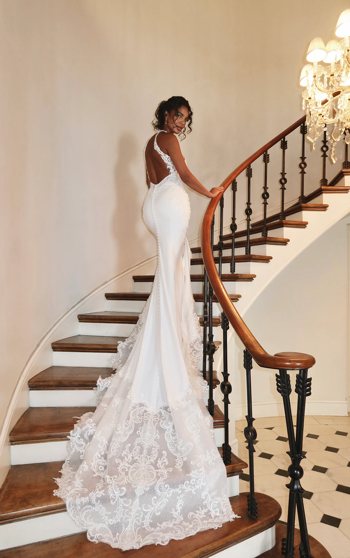 1787 features a high halter neckline of exquisite scrolling graphic lace that attaches to a sheer embellished bodice adorned with stunning beadwork and sparkling accents. In the back, glittering lace motifs frame a low backless detail, leading to a row of timeless fabric-covered buttons. The sleek column silhouette skims over every curve in liquid crepe fabric before giving way to a long and dramatic couture cutout.