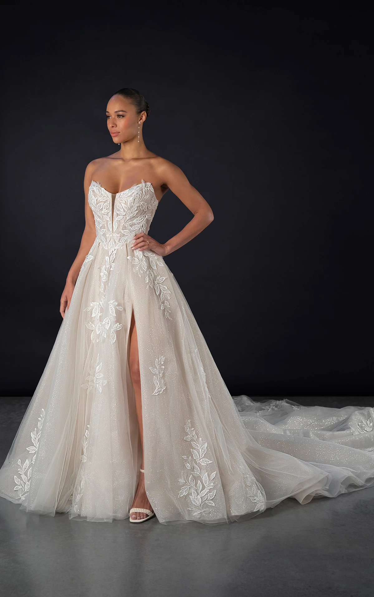 1825 features a strapless sweetheart neckline elegantly embellished with sparkling leafy lace appliqués and delicate 3D floral accents. A subtle illusion plunging neckline adds allure, while the sheer back highlights couture corset construction and timeless fabric-covered buttons that meet the edge of the train. The full A-line skirt, flowing from a pleated Basque waist, shimmers in glitter tulle adorned with scattered lace appliqués throughout. A long flowing train completes this romantic yet sexy silhouette, available in both lined or sheer unlined skirt options for a personalized touch of modern elegance.