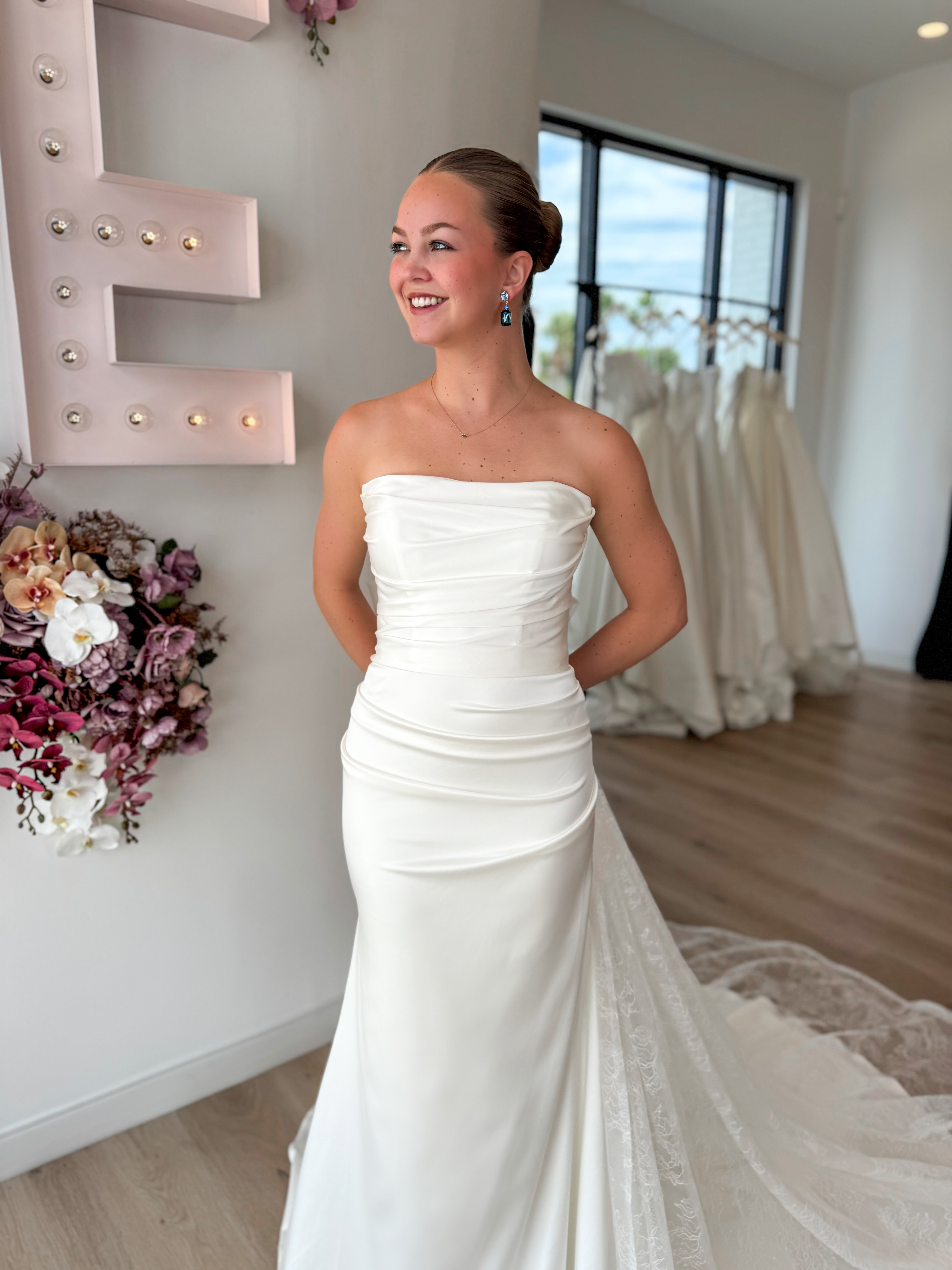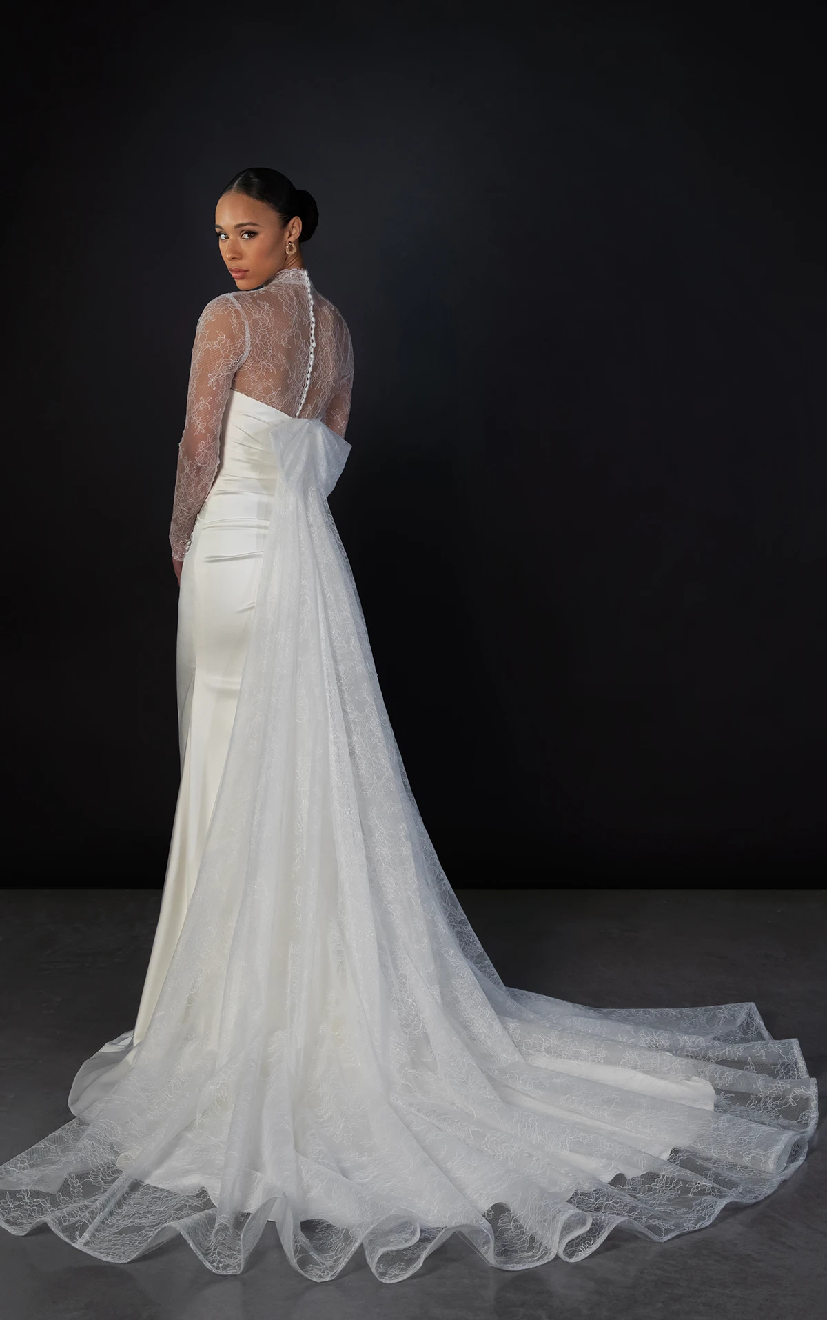 1874 is a modern column wedding dress in opulent satin fabric featuring a detachable long sleeve lace topper and detachable lace train. The draped strapless bodice scoops at the neckline and wraps around the figure, ending with a gown-length row of fabric-covered buttons. The detachable lace topper with an elegant high neckline adds delicate floral lace to the bodice, extending the gown-length row of fabric-covered buttons down the back. The clean and chic column silhouette ruches at the back hip before flowing into a detachable lace train that cascades from a modern bow detail.