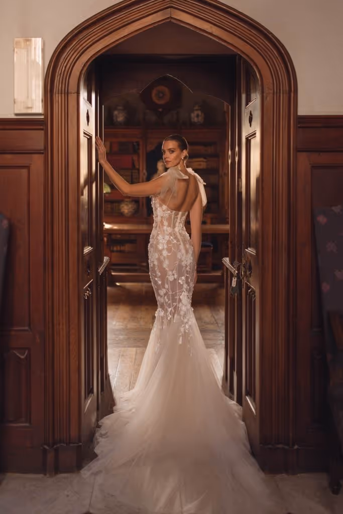 Sexy and elegant, the 24-P05 dress features a fit-and-flare silhouette with delicate lace details, thin straps, and a low back. Modern and alluring, it embodies the signature high-fashion style of Berta Privee.