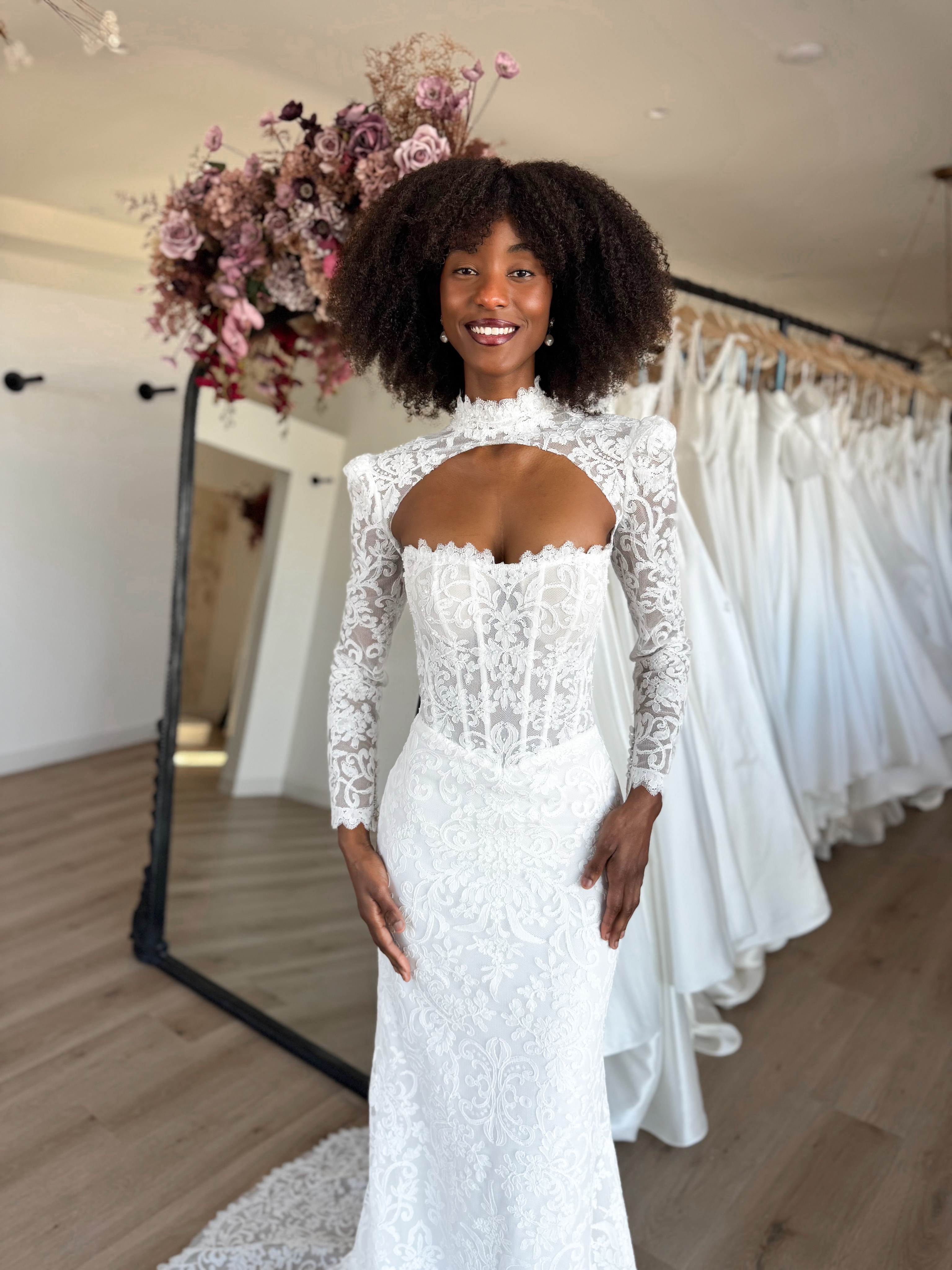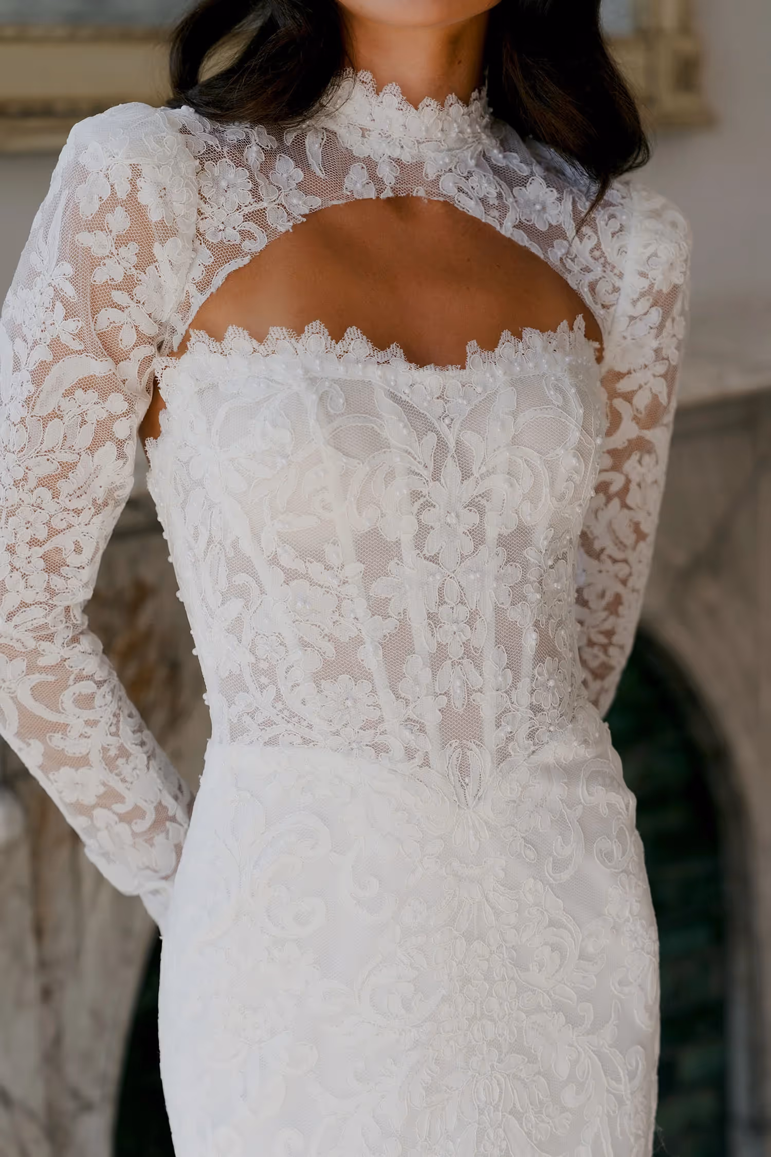 The Alaina dress features an inclusive neckline paired with a chic V-shaped waistline, complemented by a sleek, linear skirt design. Crafted from classic corded lace, the fabric boasts intricate engravings and maintains delicate lace detailing along the skirt’s edge, enhancing the dress’s overall elegance and completeness.