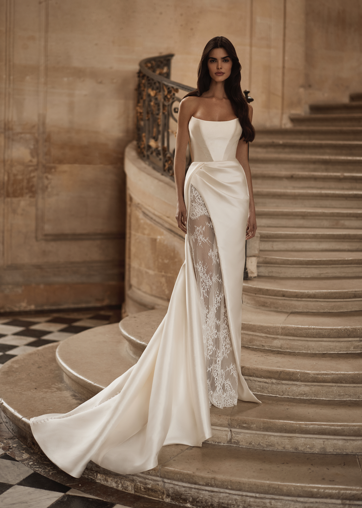 Aldrans by Milla Nova is a chic mikado gown with a sheer chantilly lace underskirt. This gown features a sheath silhouette, a straight neckline, boned corset bodice, pearl buttons to the end of the train, and a fitted draped skirt with a daring side slit that reveals the romantic chantilly lace underskirt. Perfect for the modern bride.