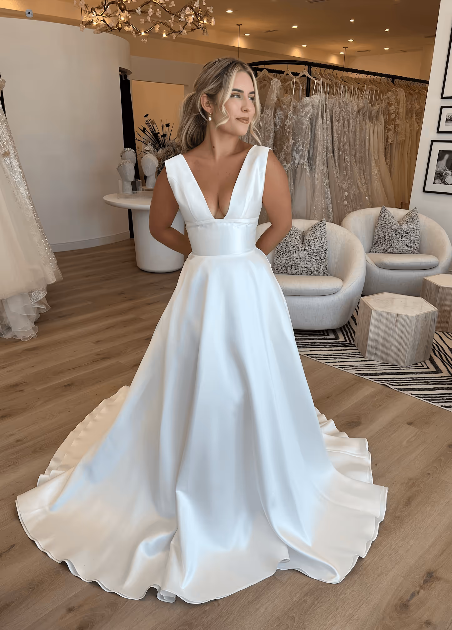 Amara by Sarah Seven is the A-line wedding gown of your dreams. Effortlessly chic and modern, this satin gown is made for the bride who loves a clean, timeless look with a touch of cool confidence. The deep V-neckline and wide waistband create a sleek, flattering shape, while the soft satin skirt drapes beautifully and moves with ease.
