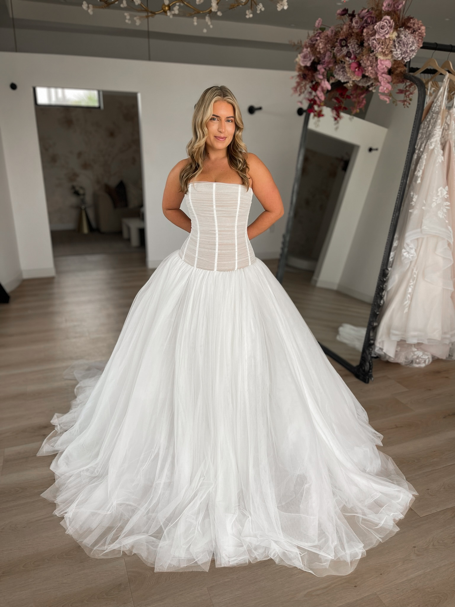 Balletcore energy en pointe via Beau. Its structured, dropped waist bodice is artfully draped with soft tulle, but it’s the full, gathered skirt that delivers the kind of drama that is usually reserved for the stage.