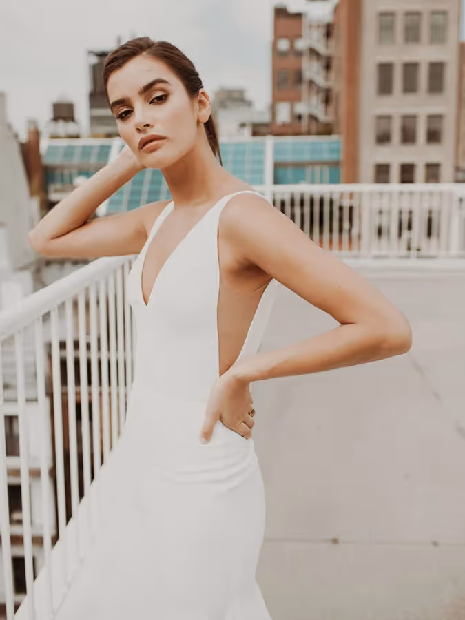 Belmont by Sarah Seven is a sleek crepe gown with a V‑neckline, thin straps, side cut‑outs and a dramatic train — designed for the modern bride who wants understated elegance with high impact.