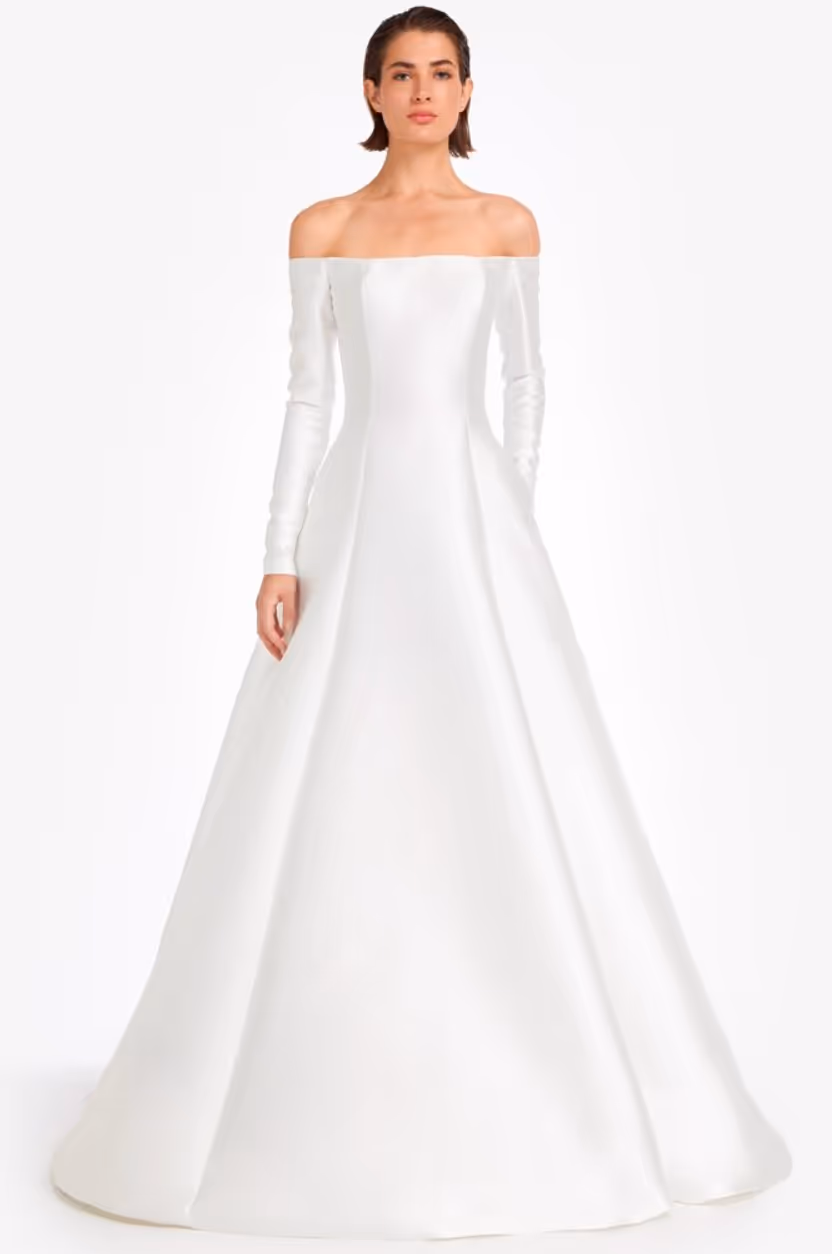 This wedding gown is ready-to-wear and available off the rack for purchase. A refined silk-blend Mikado off-shoulder ball gown featuring elegant princess seams for a sculpted, figure-flattering fit. The voluminous skirt adds a touch of grandeur, making it ideal for a bride who desires a sophisticated yet dramatic bridal. Off the shoulder satin sleeves give a royal feel. Available in a size 8.