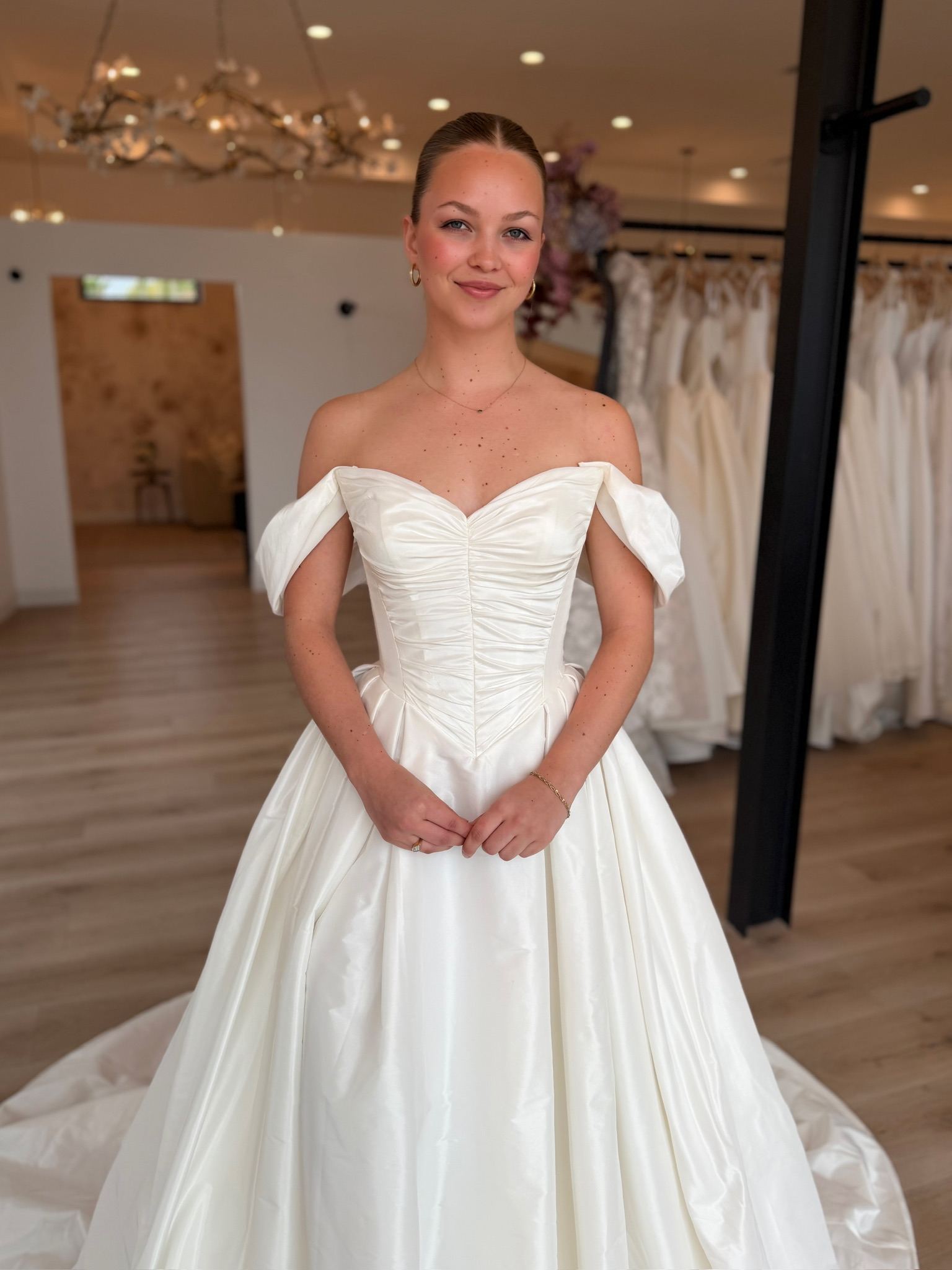 This wedding gown embodies a classic, modern vintage aesthetic, perfect for brides who appreciate a refined yet regal look with a touch of timeless elegance. The bodice features meticulously hand-gathered fine pleats, strategically placed clean lines, and the trending Basque V-waistline—giving the traditional courtly style a modern twist. The built-in corset with boning provides strong structural support, enhancing the silhouette. Crafted from silky taffeta with a natural luster, this fabric offers a soft, airy volume, aligning with the latest fabric trends for a sophisticated yet lightweight feel.