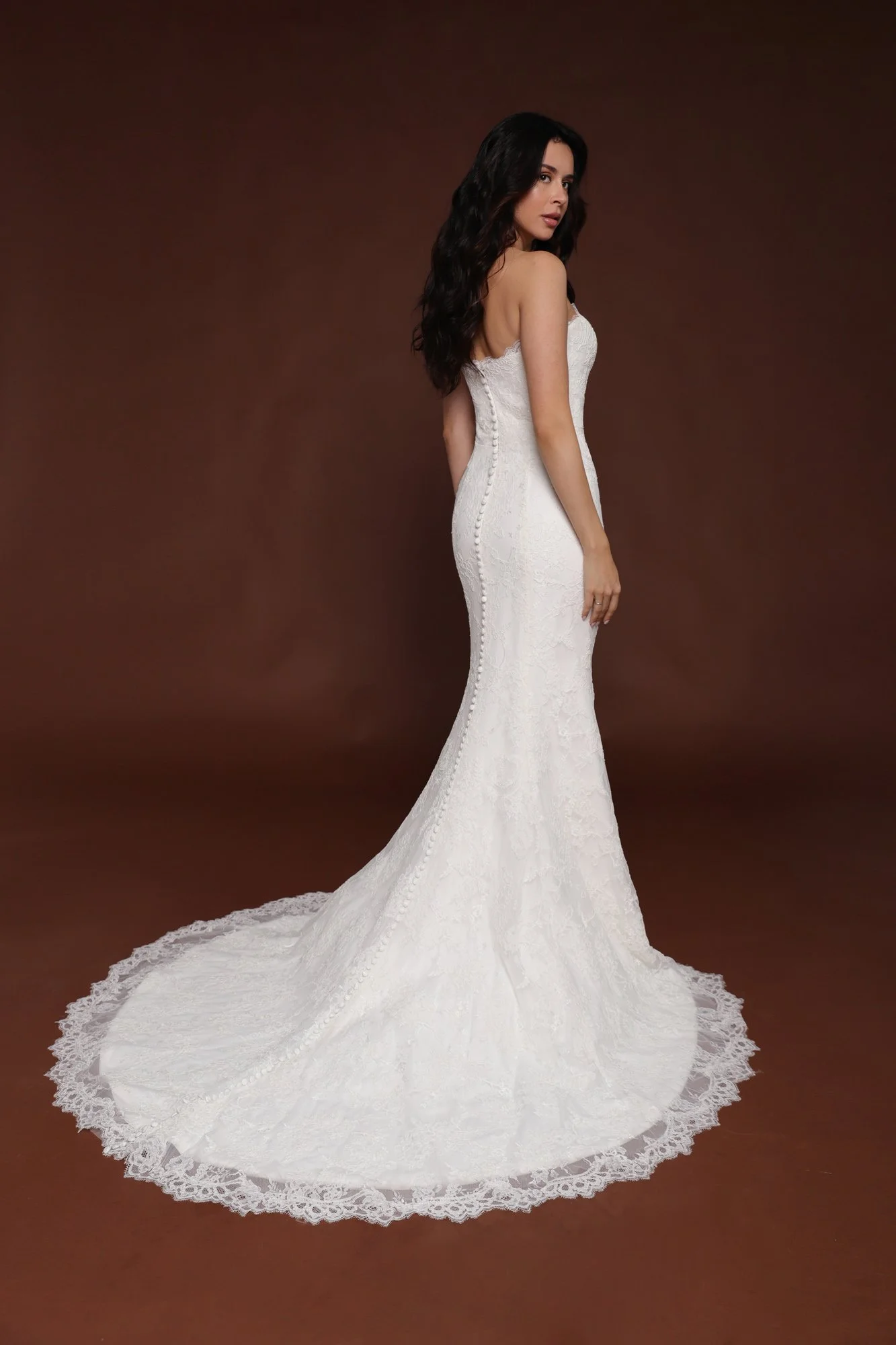 Canary is a stunning strapless lace modified mermaid wedding gown featuring a straight across neckline with a flattering satin waistband and buttons to the end of the chapel train.