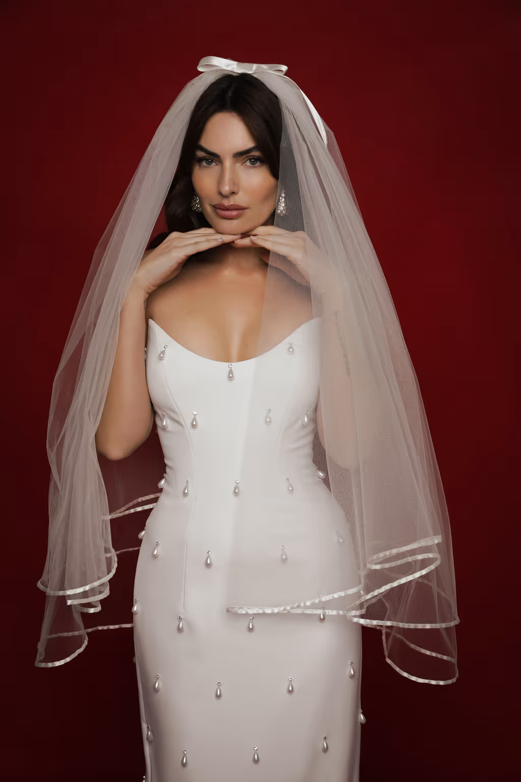 Candy by Sarah Seven is a strapless column gown with a sleek curved neckline, sprinkled with pearl and crystal detailing — modern, glamorous, and effortlessly elegant.
