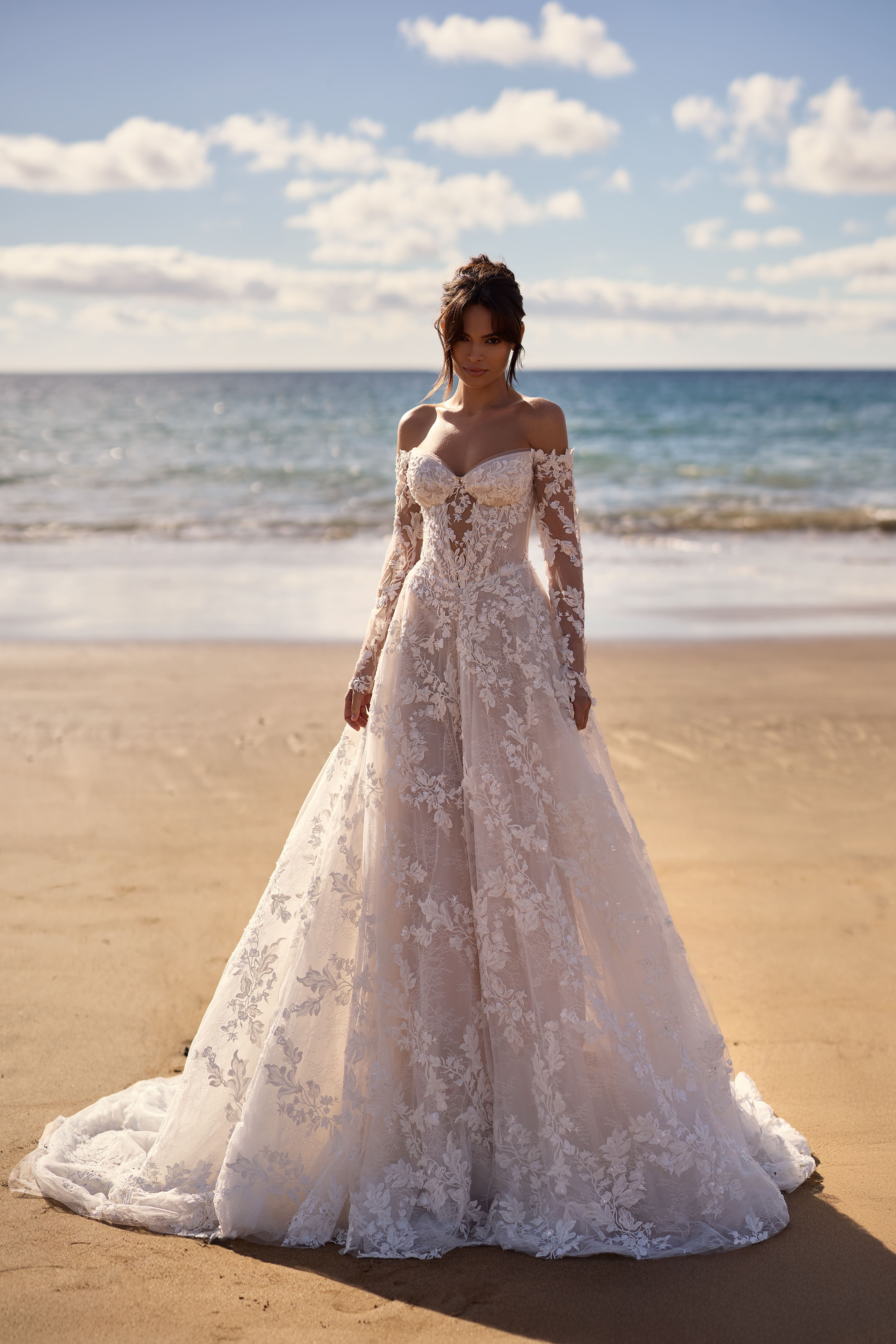 Charm by Milla Nova is an enchanting long-sleeved off-the-shoulder A-line wedding gown made from lace with stunning floral motifs. Featuring a heart-shaped neckline, a boned corset with a V-shaped sheer insert in the center, off-the-shoulder sheer long sleeves adorned with florals, a back zipper closure, and a classic A-line skirt shape. Perfect for the bride who wants a modern day fairytale with a romantic feel in every detail.