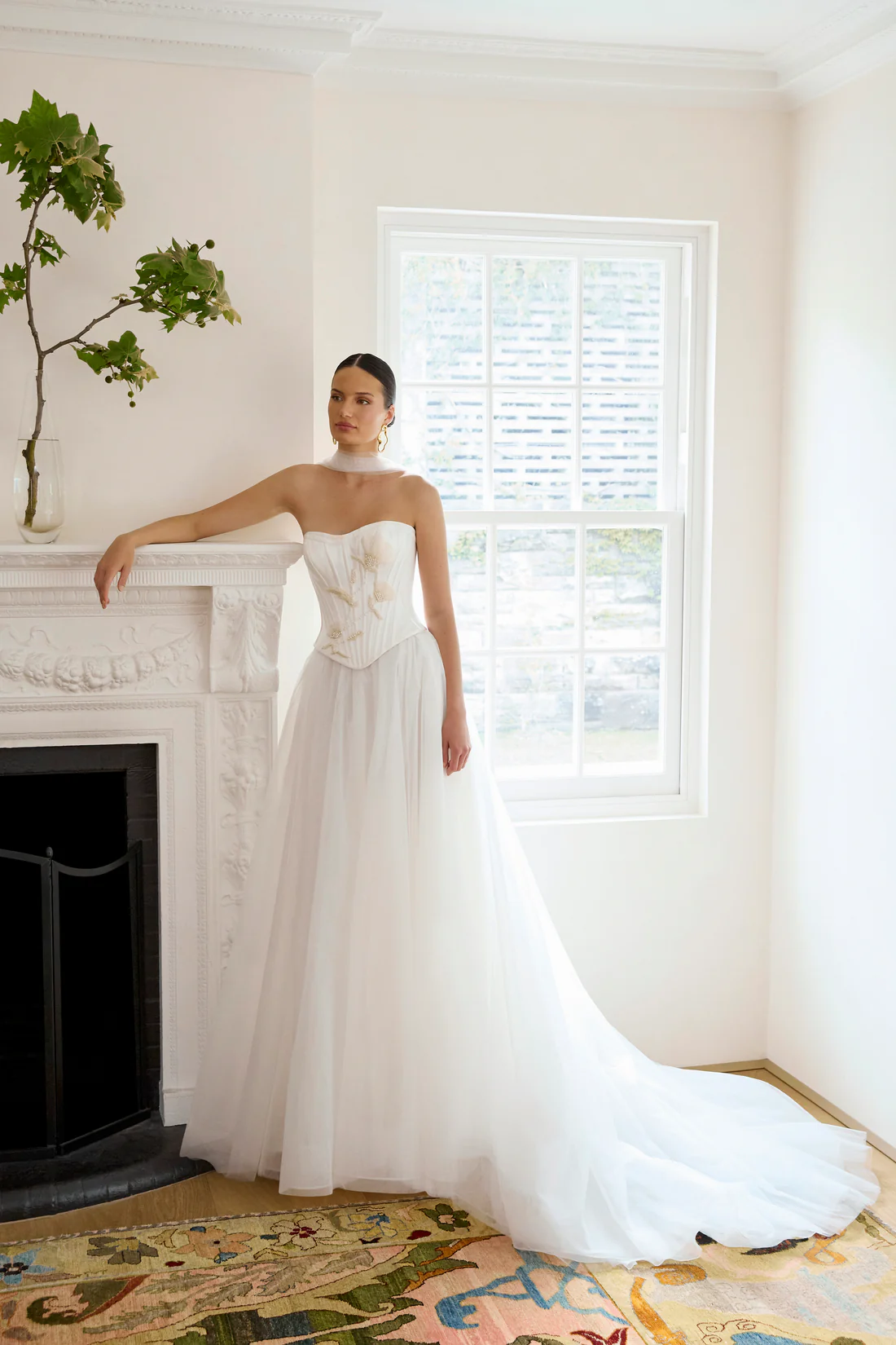 Clemmie by La Premiere is a romantic two-piece gown featuring a corset-style bodice with striking boning, delicate floral detail, and a modern basque waist, paired with a soft, flowing tulle skirt for an effortlessly elegant bridal look.