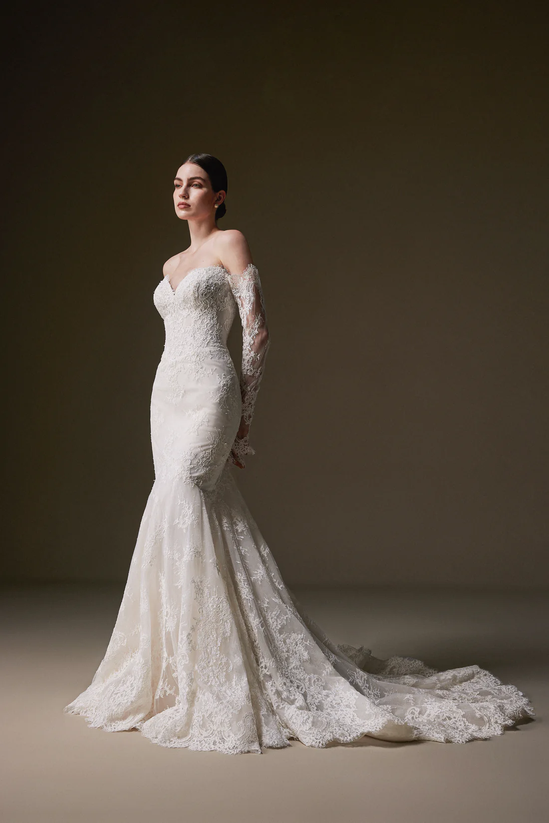 Cyrilla by La Premiere refines the mermaid silhouette with couture detail. A sweetheart neckline and V-shaped waist flatter the figure, complemented by softly flared optional sleeves that move gracefully. Boned lace highlights the waist and cascades into a layered hem over a sparkling underlay. Delicately arranged trims and refined construction create depth and luminosity, while the skirt flows with regal ease. Cyrilla balances allure with sophistication for a look that is both modern and timeless!