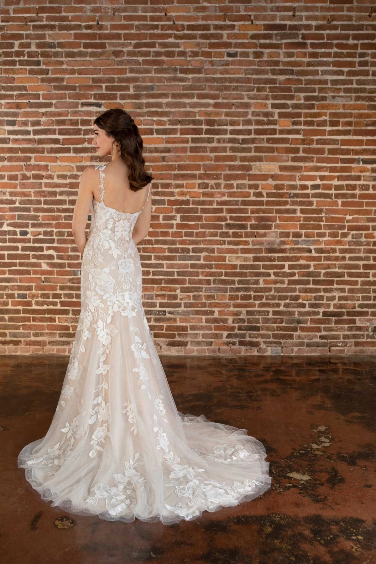 D3709 blends modern sophistication with timeless romantic bridal elements. From the soft matte lace shoulder straps, a contoured sheer bodice dives into a deep plunging neckline framed in the natural edges of the gorgeous floral lace. In the back, a squared low back detail highlights the tailored construction and symmetry of each carefully-placed lace appliqué. Past the hip, this romantic gown opens into soft floral appliques that trail the tulle layered skirt and train to complete this enchanting fit-and-flare wedding gown.
