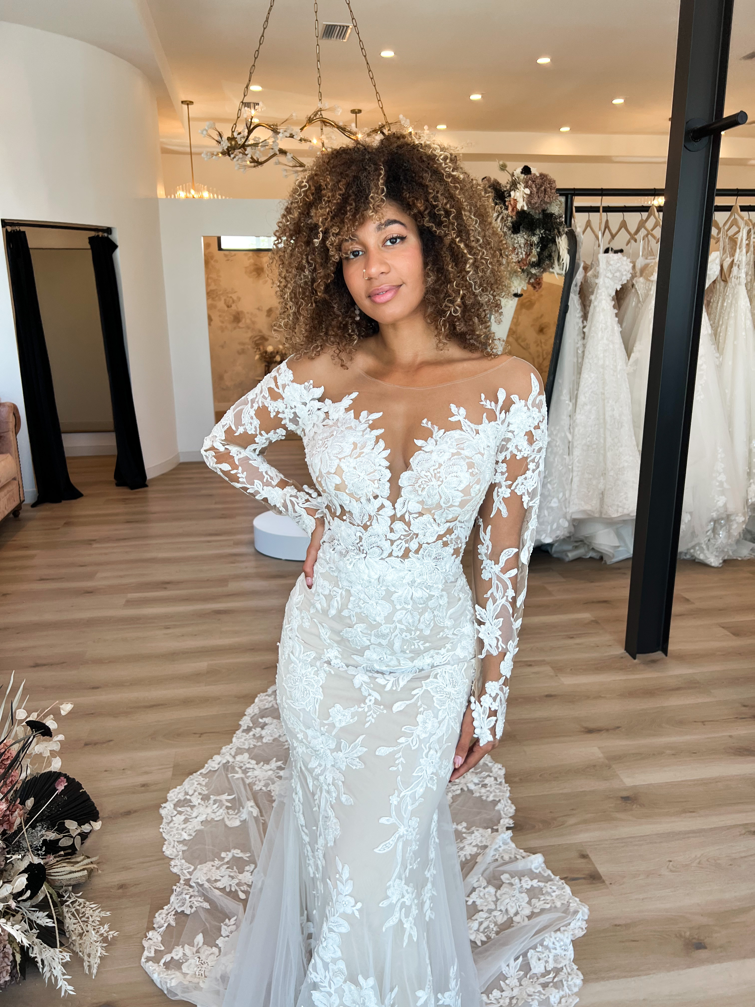 D3284 from Essense of Australia is a blend of floral bridal design and ultra-modern fashion. A sheer bodice starts the look off with a bold statement, creating a semi-off-the-shoulder illusion with nude tulle and floating tattoo laces--thoughtfully dispersed throughout the bust and waist for tasteful and flattering coverage. The floating laces continue over the long sleeves, with an organic finish on the cuff for a hint of classic nostalgia. A slight shimmer throughout the fit-and-flare design echoes modern luxury and just a touch of drama, without overwhelming the look. The wide open back is also edged with floating lace details for a fresh, fierce look. Finally, the extra-long scalloped train perfects your bridal moment with incredible organic lace finishing.