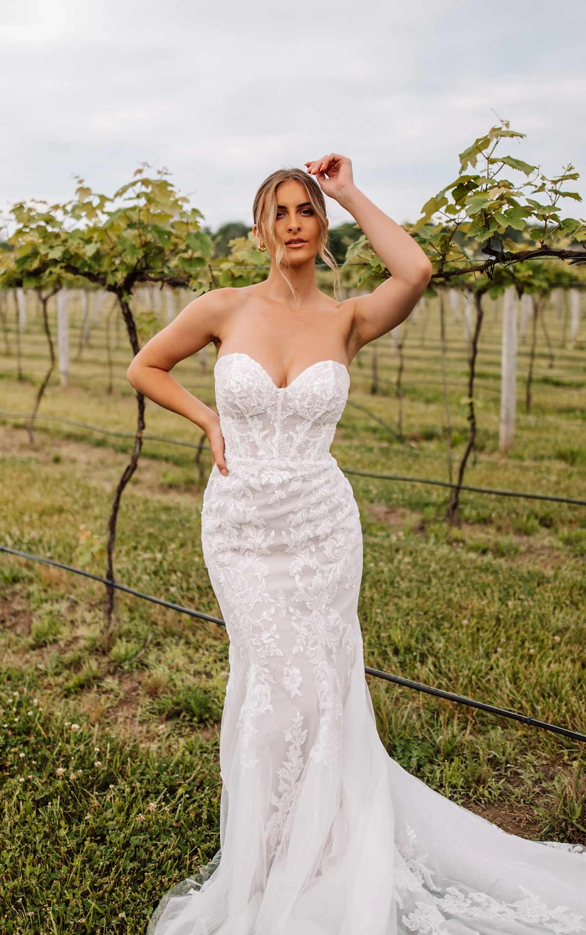 An allover lace masterpiece, Essence of Australia's D3647 sparkles with the beauty and luxury of a designer wedding dress. The strapless sweetheart neckline of the sheer bodice highlights the architectural corsetry, combining Old World romance with contemporary linear fashion design. The illusion tulle back with exposed boning and a single row of fabric-covered buttons highlights the bodice even further for a timeless appeal. Expertly-placed sparkling lace appliqués scroll throughout the fit-and-flare skirt before flaring into a gauzy dream-like train with lace accents to complete this picturesque bridal look.
