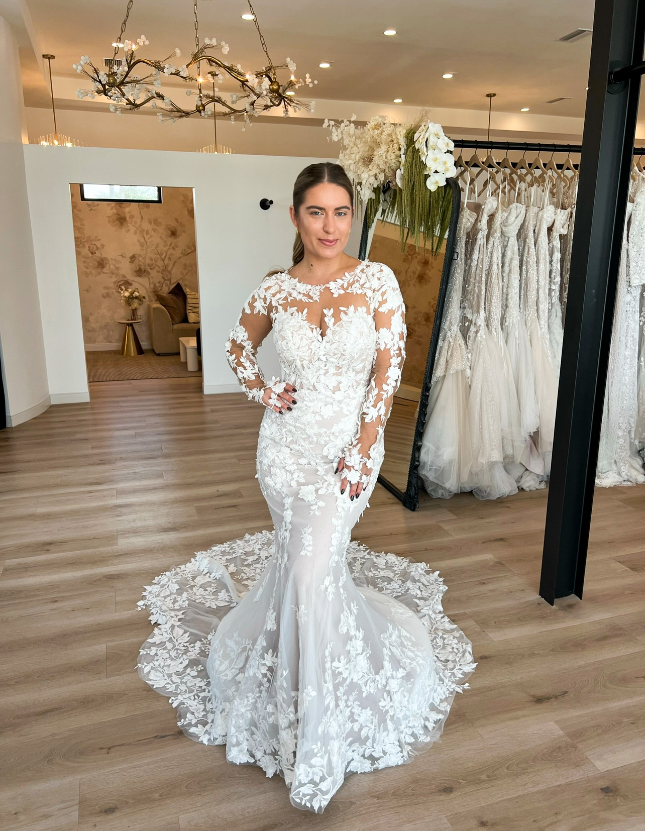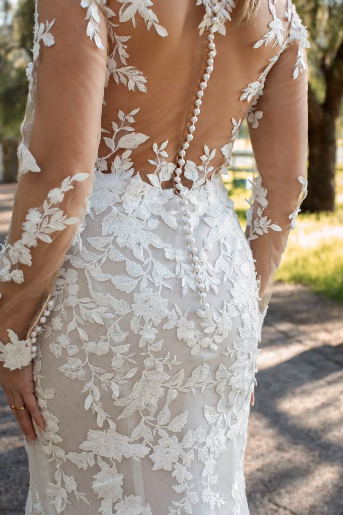 D3776 features a stunning vintage-inspired floral lace from its high illusion neckline to its swoon-worthy shaped train. Sheer long lace sleeves seamlessly melt into a sexy illusion bodice of lace and tulle before opening into a captivating open back detail embellished with pearlescent buttons. From the waist, the sheer bodice transforms into a lined lace fit-and-flare skirt, accentuating the figure and flaring into a soft and sweeping cutout train to complete this epically romantic wedding gown.