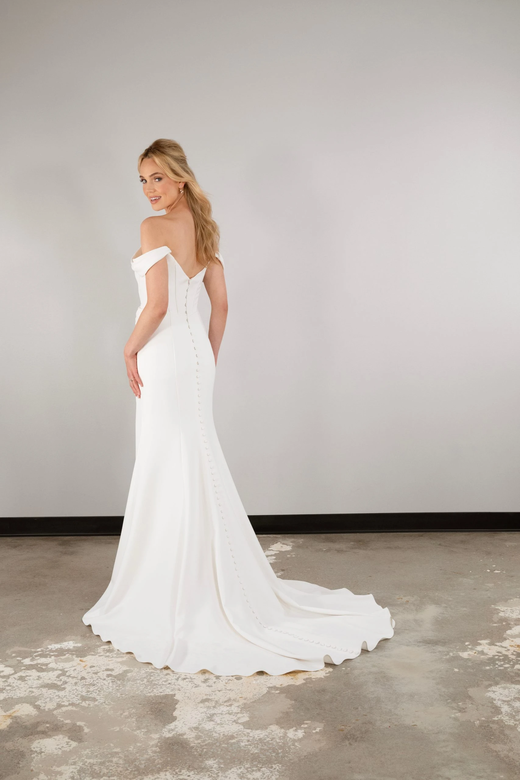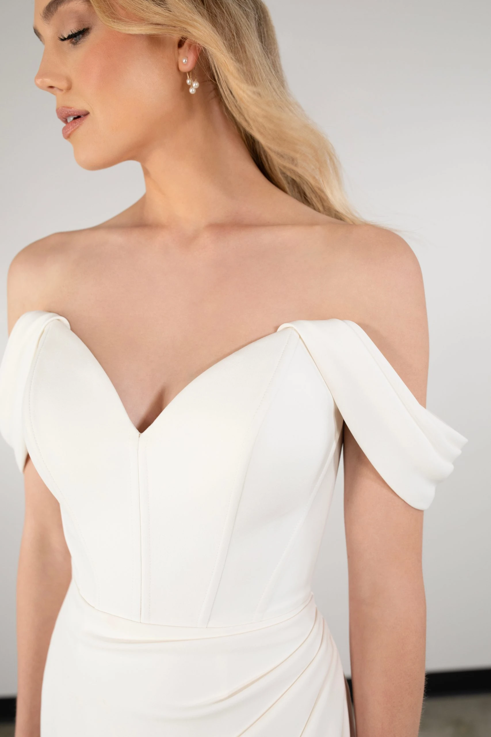 Elegant and refined, D3864 combines classic bridal with modern designer features in this glamorous column wedding dress. Detachable off-the-shoulder straps connect to a flattering sweetheart neckline in luxurious stretch crepe, adding an element of sophistication to the contemporary structured bodice. Highlighting the figure in this classic column silhouette, an optional high leg slit adds a touch of drama before extending to meet the luxe skirt and train of this glamorous wedding gown