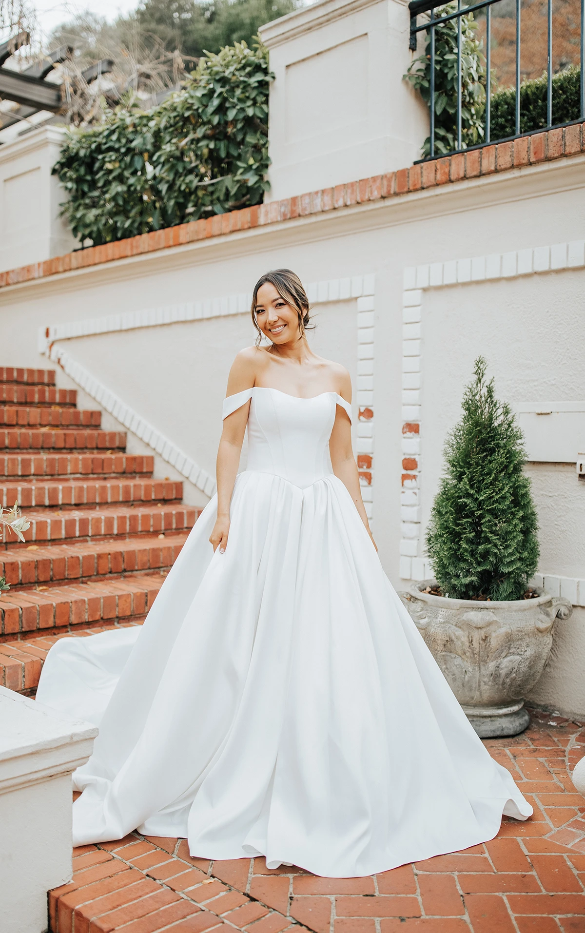 D4110 features sleek off-the-shoulder straps and a flattering scoop neckline as the impeccably tailored bodice hugs the figure with contour seams, fastening into a gown-length row of fabric-covered buttons down the back. At the waist, luscious Mikado cascades into a voluminous ballgown skirt and train, concealing functional side pockets. Luxurious and chic, this Mikado ballgown wedding dress was made for modern royalty.