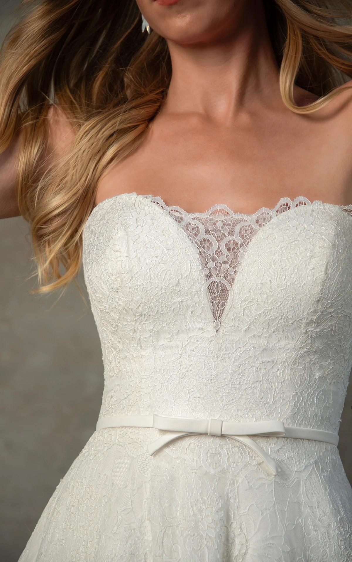 D4191 features a strapless sweetheart neckline framed by rustic floral lace. A detachable satin bow belt defines the waistline, where matte floral lace cascades into a full A-line skirt, forming a timeless bridal silhouette. Raw lace edges along the neckline and train add a rustic, romantic touch to this stunning strapless lace wedding dress.