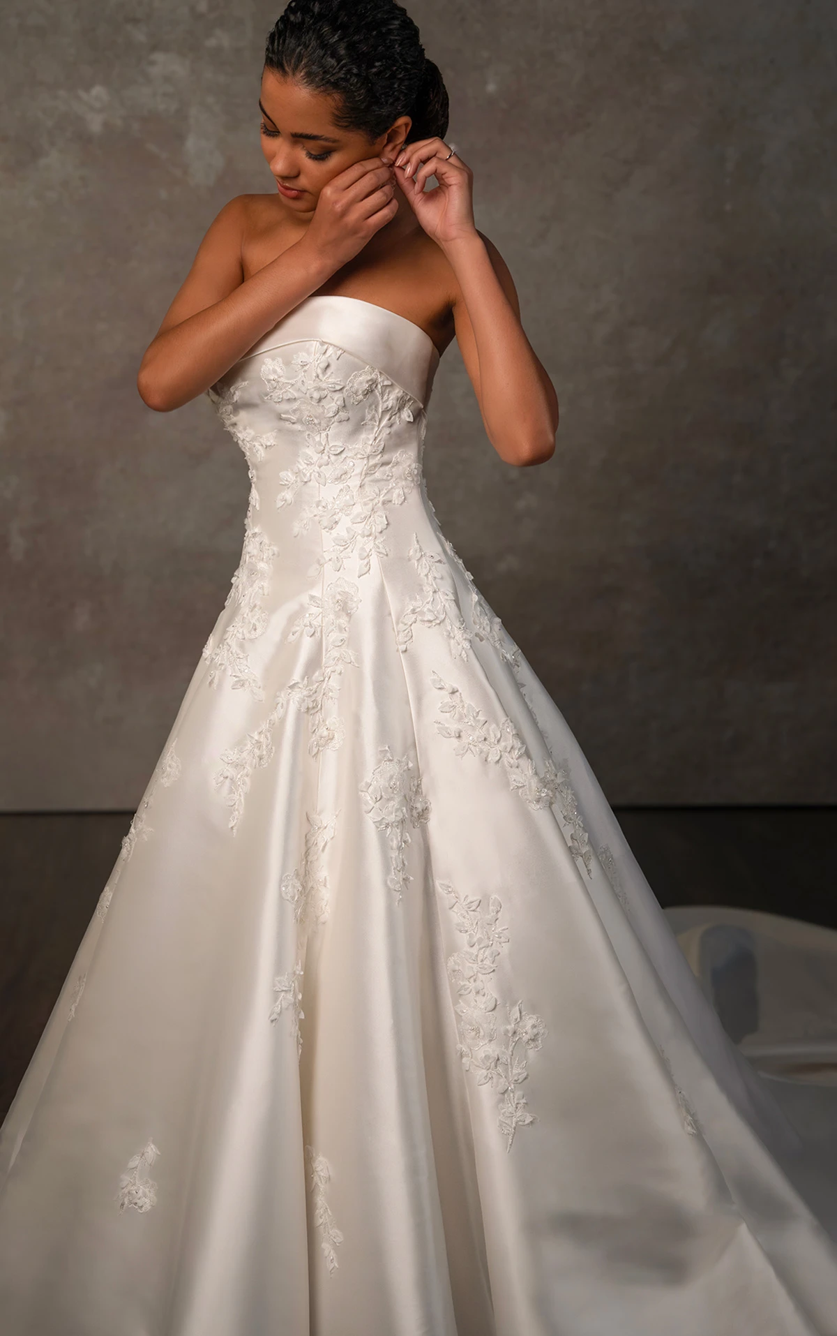 D4195 is an A-line wedding gown, modest yet enchanting choice for the modern romantic. D4195 features a straight-across strapless neckline gracefully draped in chic Mikado fabric. Romantic 3D floral lace appliques are intricately placed throughout the bodice and entire gown for a tasteful and luxurious bridal look. The classic A-line silhouette gracefully flows from bodice to skirt, creating a seamless and timeless look as fabric-covered buttons run the full length of the back of the gown, meeting the edge of the lace-detailed train. This romantic floral lace wedding dress offers a thoughtful blend of traditional charm and contemporary elegance.