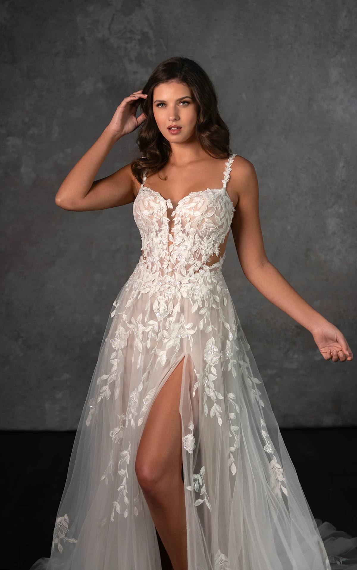 D4258, a dreamy lace wedding dress with a hint of bohemian charm. Delicate lace spaghetti straps frame a plunging sweetheart neckline, leading to a sheer lace bodice adorned with intricate 3D floral appliques. Peeking through the design, sexy corset boning adds a touch of allure and structure. From the classic Basque waist, layers of frothy tulle cascade into a soft A-line silhouette, accented by a tasteful leg slit for a modern edge. Blending whimsical romance with contemporary boho elements, this enchanting wedding gown is the perfect balance of timeless beauty and effortless style.