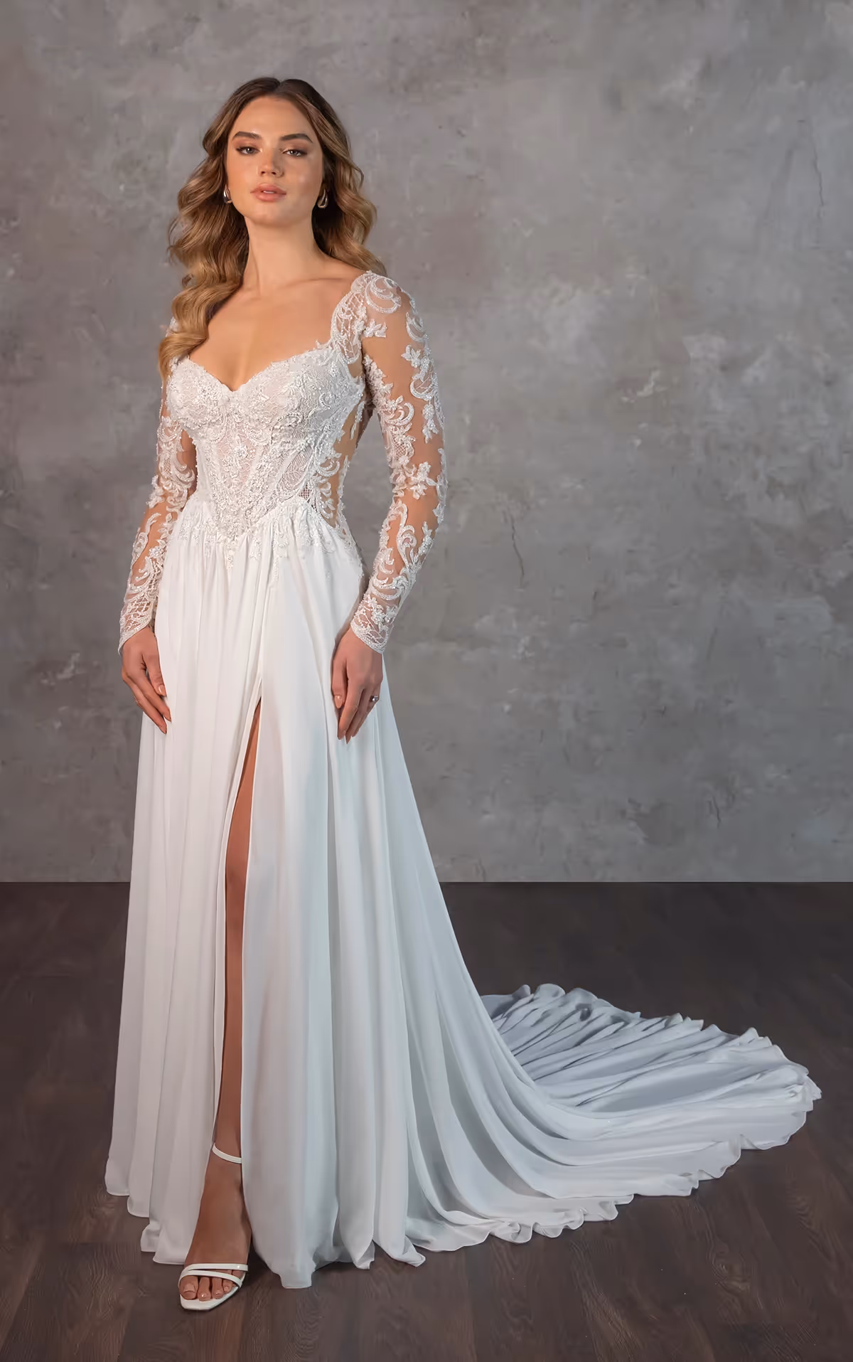 D4350 captivates with its exquisite blend of lace and chiffon, designed for the modern bride with an eye for detail. Delicate sheer floral lace long sleeves gracefully frame the soft sweetheart neckline, while scrolling graphic lace and encrusted beading adorn the sheer bodice. Striking side cutouts add an alluring touch, leading to a dramatic sheer scoop back accented by a short row of crystal buttons for a timeless finish. From the Basque waist, a sleek A-line skirt cascades effortlessly to the floor, flowing with every step. A high leg slit adds a sultry element, completing this breathtaking bridal vision.