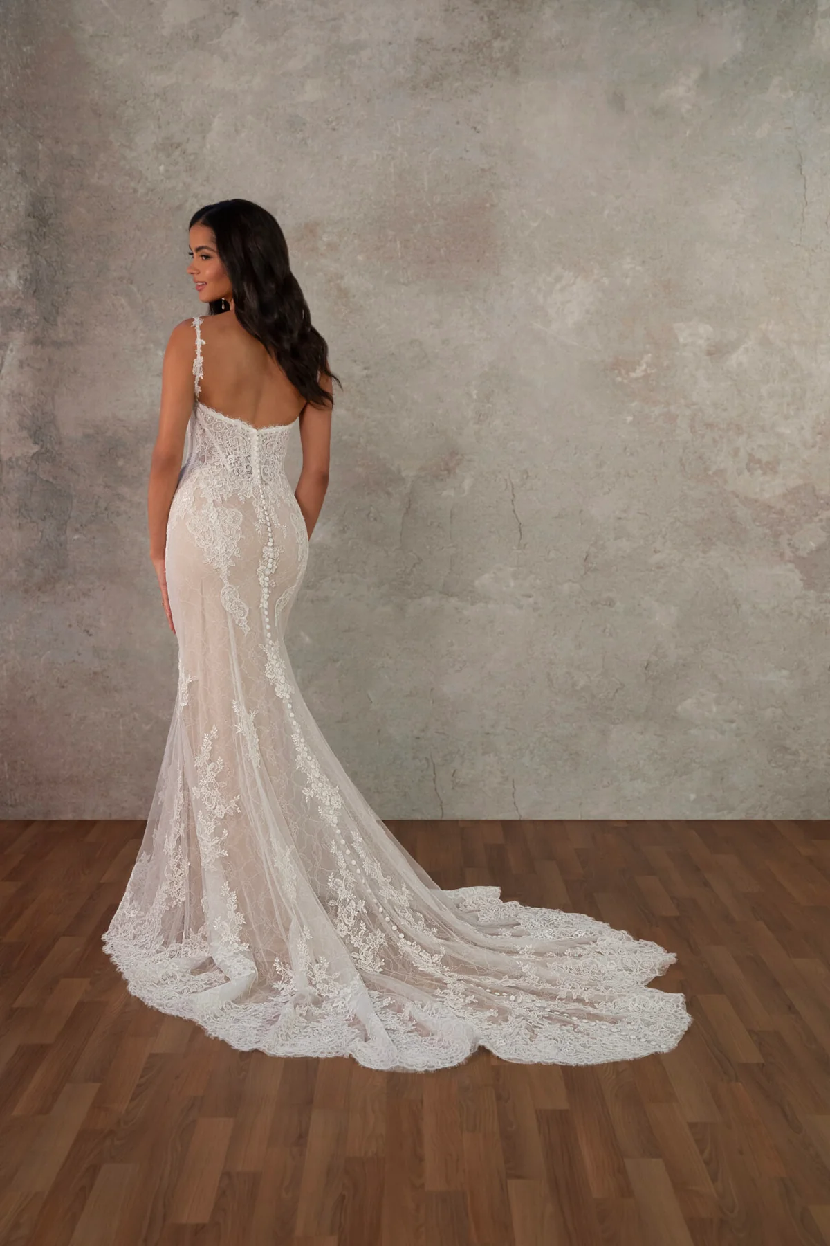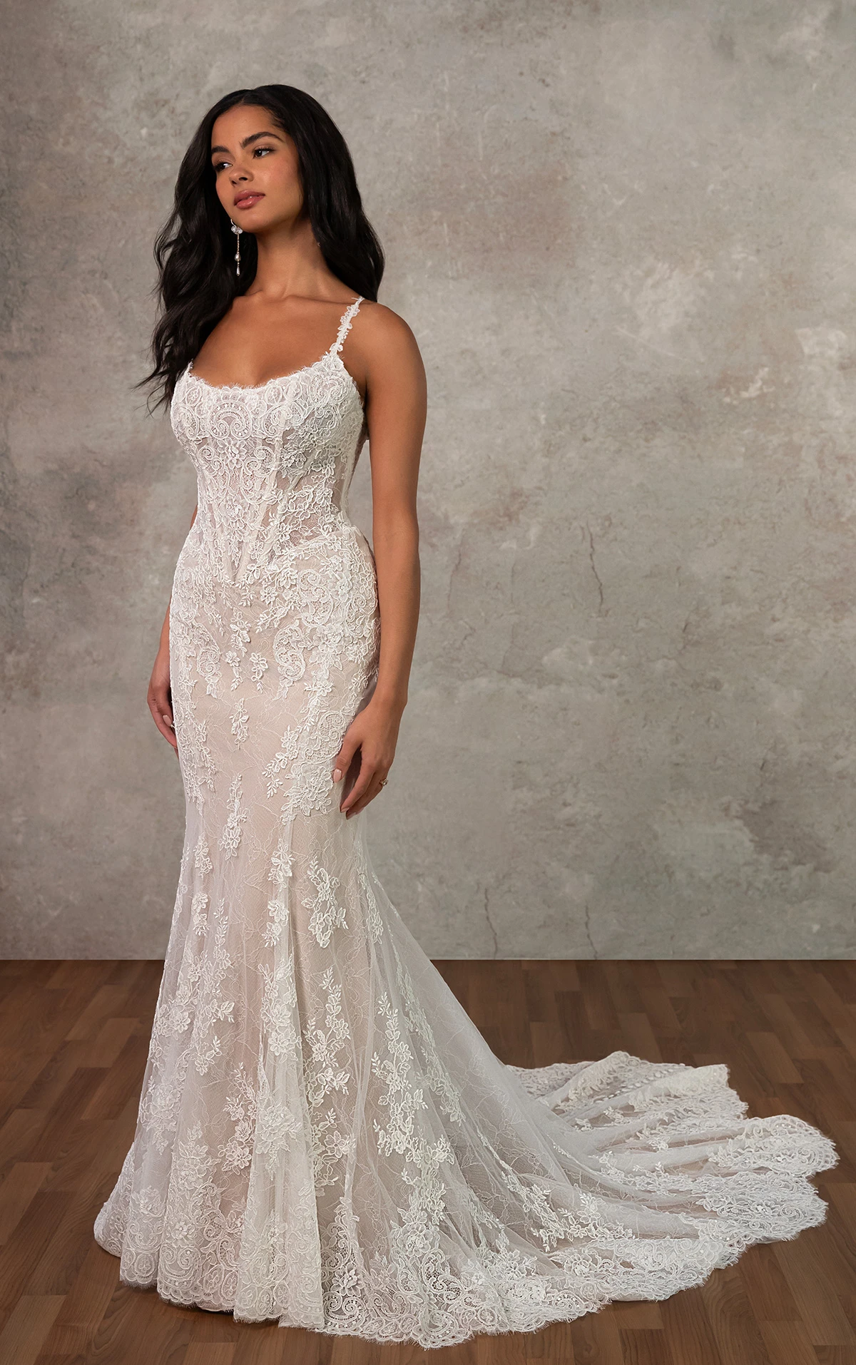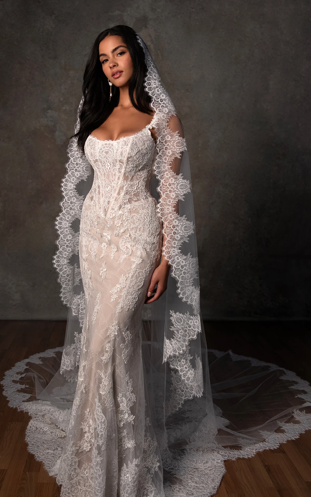 D4437 is a romantic revival of old-world elegance, blending vintage-inspired details with a refined silhouette. Crafted in lace and tulle, this fit-and-flare gown features a soft scooped neckline with lace-shaped straps and a structured bodice with corset boning for subtle definition. A delicate Chantilly lace underlay adds texture beneath matte floral lace appliqués, while the Basque waist elongates the frame with a nod to classic design. The look finishes with a scalloped lace-shaped train, offering a dramatic and graceful finish for the bride drawn to timeless craftsmanship and beauty.