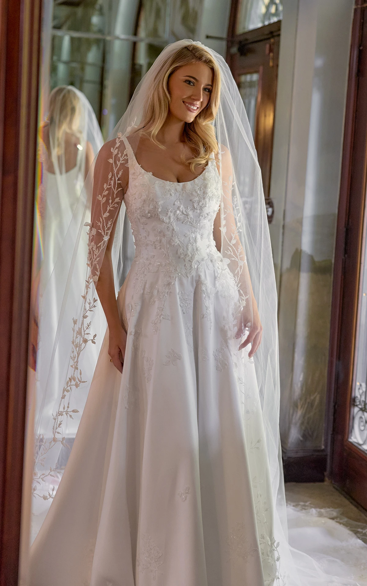 D4471 transforms minimal glamour into romantic couture with its sleek satin A-line silhouette adorned in dimensional detail. Wide shoulder straps frame a modern scoop neckline and a flawlessly structutred bodice embellished with 3D floral lace appliqués, adding texture and depth to the clean design. In the back, a graceful scoop back highlights a tie-up back that extends into a row of fabric covered buttons. The flowing skirt sweeps into a chathedral train to complete this contemporary yet romantic wedding dress.