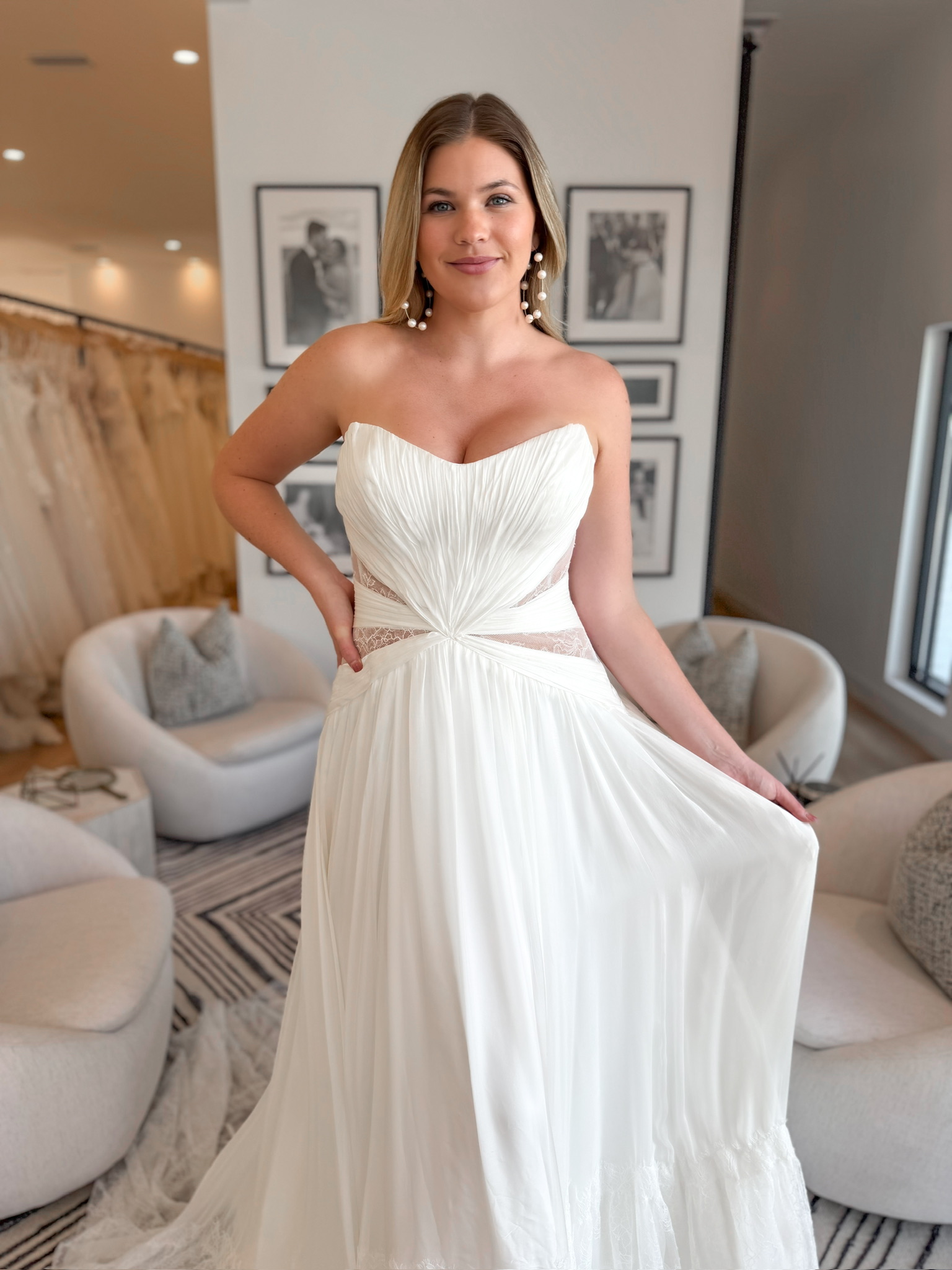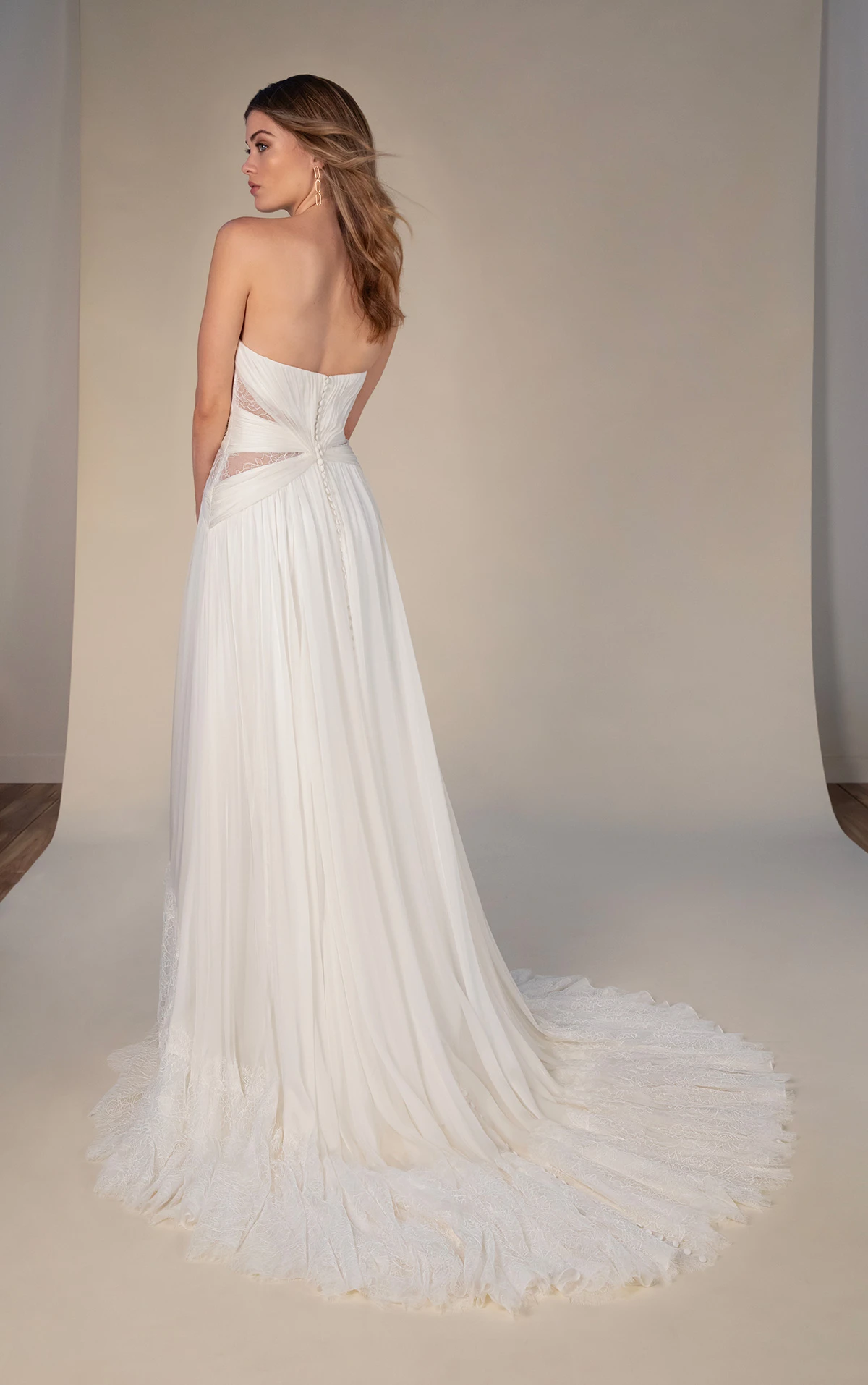 The Denver gown is a strapless chiffon wedding dress with a beautifully draped lined bodice with a soft scoop neckline. Vertical ruching cinches the waist and highlights the natural curves, wrapping the body in pure goddess vibes. Sheer side cutouts adorned with matte floral lace add a touch of romance, while the soft A-line skirt weightlessly floats down the aisle like a cloud. Fabric-covered buttons trail the entire length of the gown, from the tailored bodice to the textured chiffon hem, creating a dreamy silhouette for an epic bohemian romance wedding.