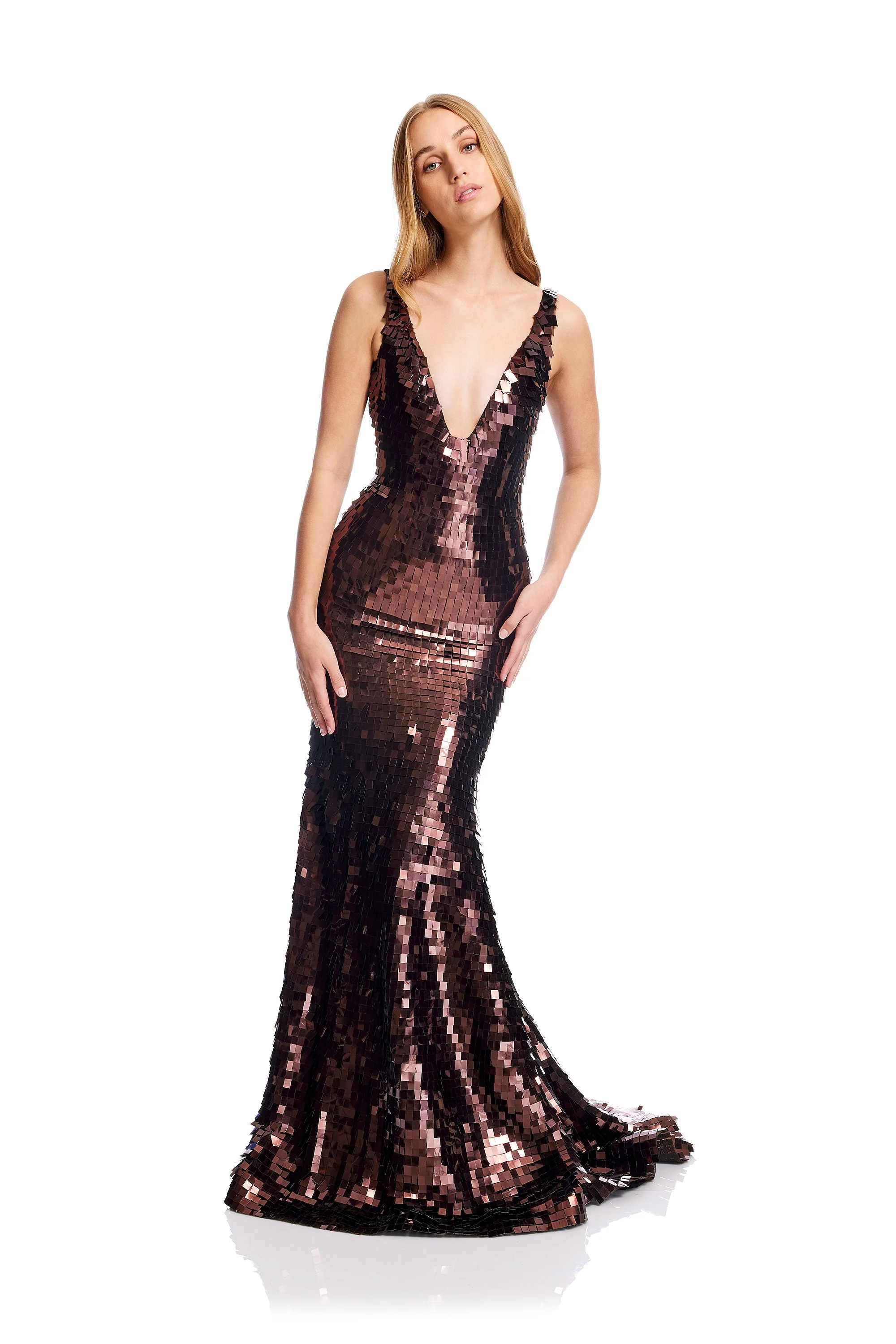 This wedding dress is ready-to-wear and available exclusively off the rack for purchase. Handcrafted in chocolate brown for the bride who wants to make a statement! Perfect for a second look or a bride who isn't looking for traidtional white. The Dolores gown by KYHA Bride features a dramatic deep square front and back neckline into a fit and flare skirt, Dolores is crafted from exclusive KYHA square sequined beading which will see you shining down the aisle and on the dance floor. Available in a size 5.