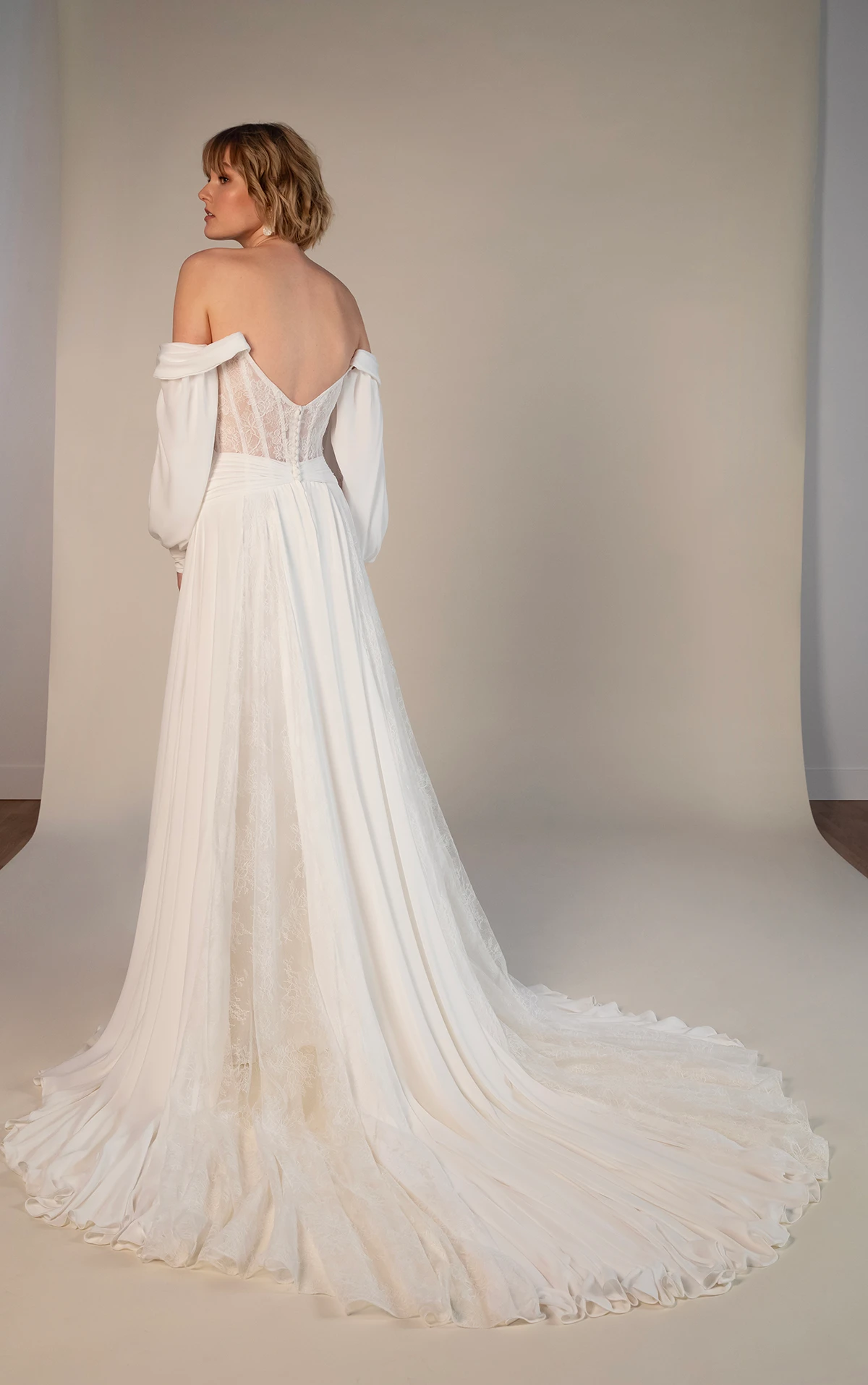 The Dune gown blends contemporary boho design with vintage lace details for a wedding gown that stuns. A strapless sweetheart neckline frames the ruched bodice with Chantilly lace cutouts to compliment the sheer corset back detail and refined row of fabric-covered buttons. Delicate off-the-shoulder straps grace the upper arm and connect to flowing detachable long sleeves that cuff at the wrist for a chic and romantic convertible wedding dress. This dramatic wedding gown concludes with a soft A-line skirt of chiffon and sheer lace panels to frame a modern cutout train for the final free-spirited touch.