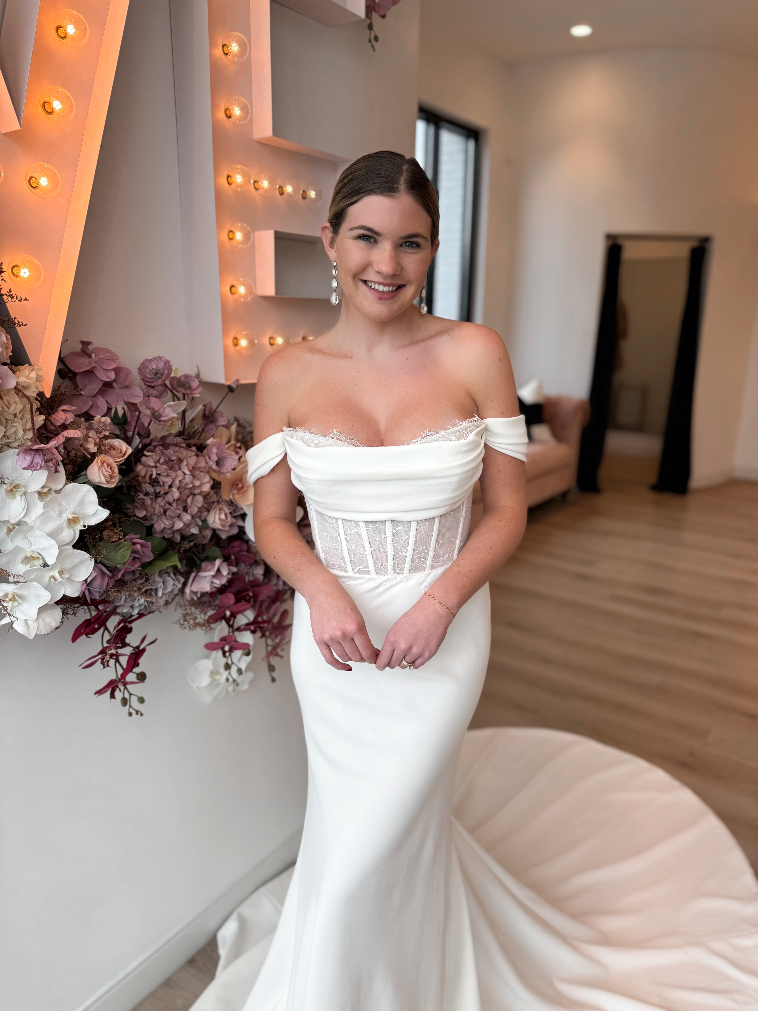 The Eva gown beautifully combines satin and French lace, offering a distinctive twist on contemporary satin styles. Crafted from luxurious crepe fabric, which is a favorite among our bestsellers, this gown showcases a refined elegance that is both timeless and modern. The harmonious blend of textures and materials creates a stunning silhouette, making Eva a captivating choice for brides who seek a unique and sophisticated look on their special day.