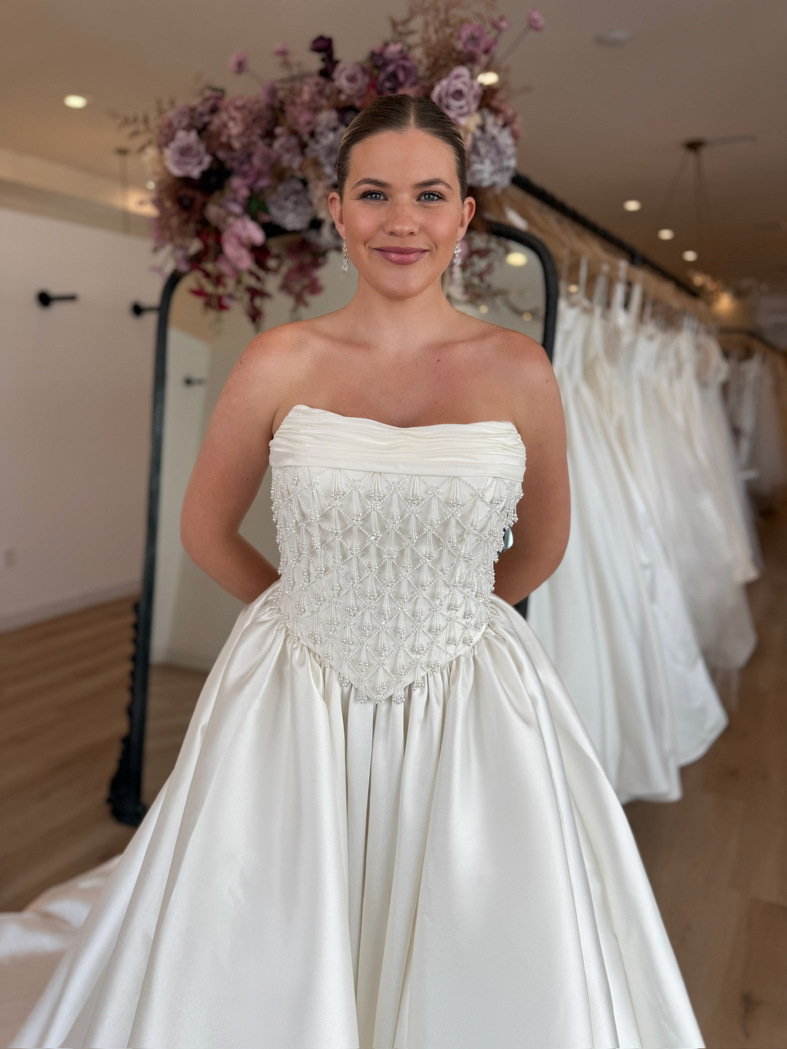 The Evie bodice is a strapless, structured design featuring soft ruching at the neckline and intricate 3D pearl beading, hand-crafted in India. The lattice-style embellishment adds elegant texture and subtle shimmer, creating a luxe, couture finish. Paired here with the Evie skirt for a full ballgown style. Wear again after your wedding day with jeans on your anniversary for a chic look you'll cerish forever!