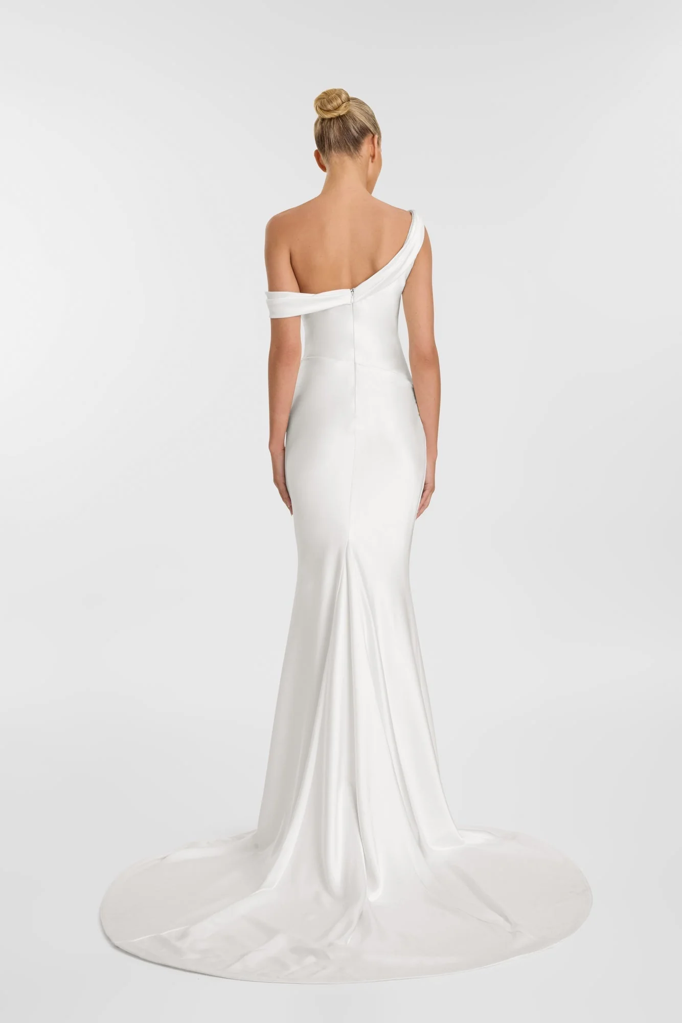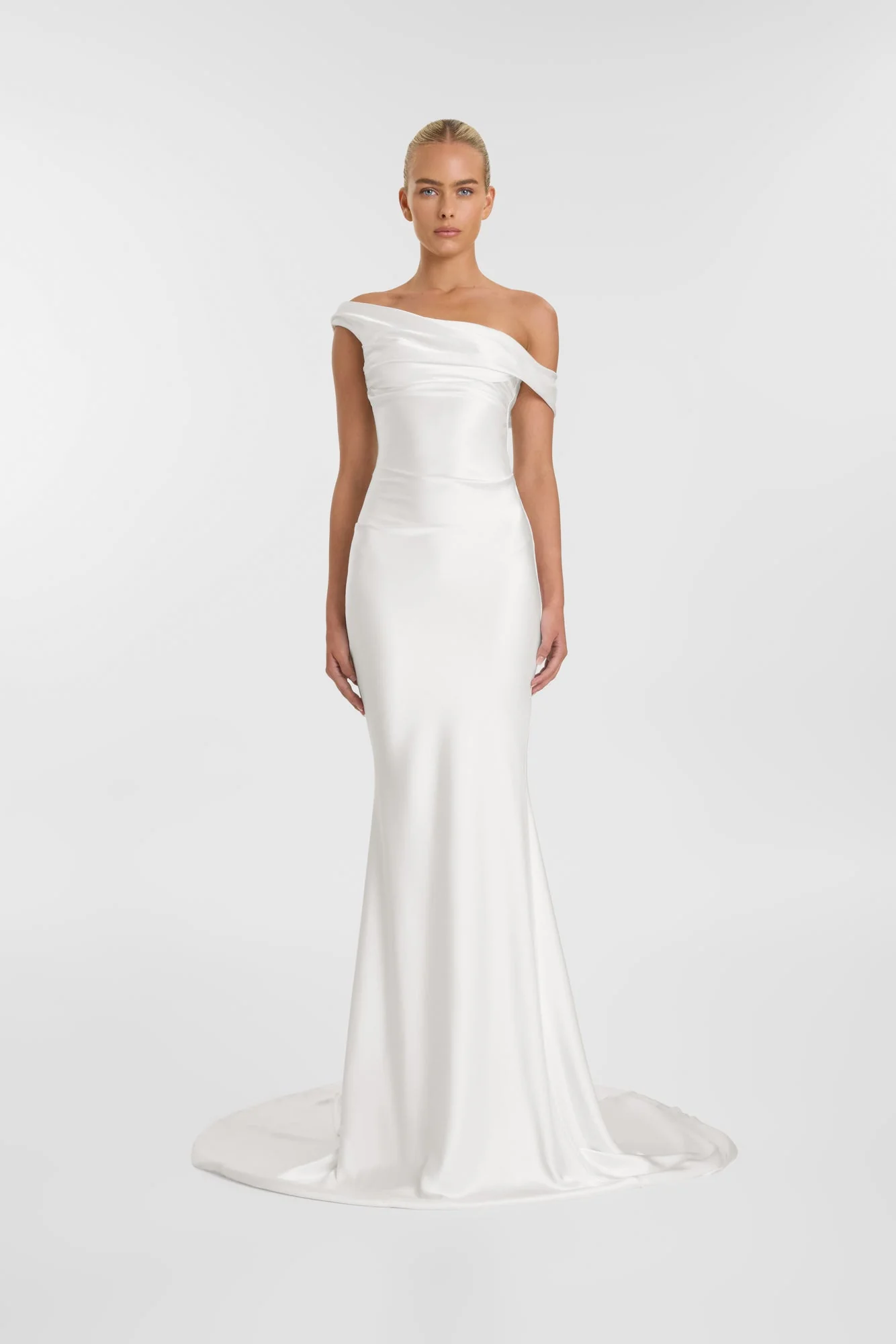 An off-shoulder, relaxed fit and flare silhouette cut from a luxe double satin. Ideal for a pared-back first look or sleek second, Fox delivers elevation and effortless in equal minimalist measure.