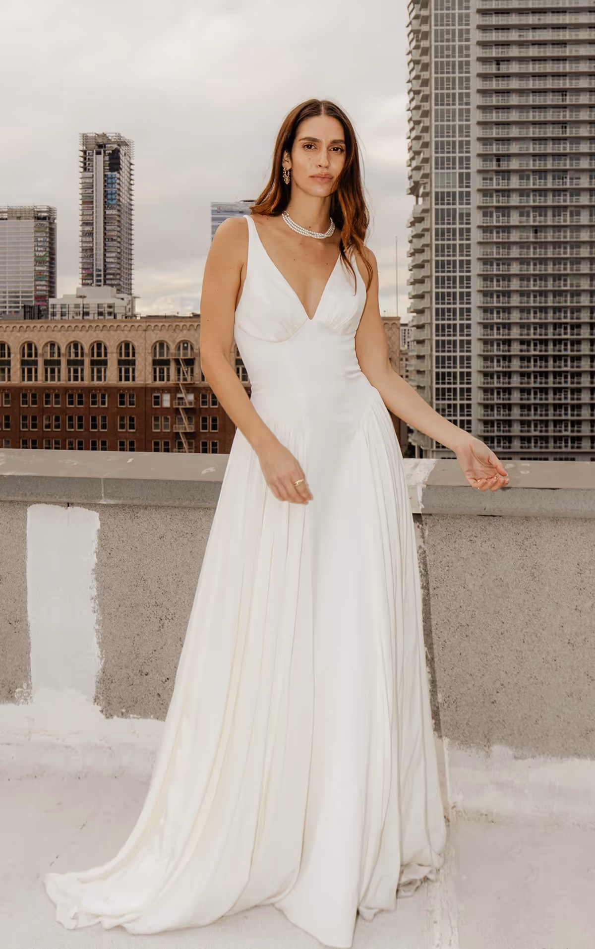 The gisele gown radiates timeless elegance from its dropped waist design to its elegant silk construction. Sleek shoulder straps dip into a deep V-neckline bodice that gathers at the bust and outlines the natural hourglass figure with a free-flowing A-line silhouette. This simple wedding gown cascades into a sea of silk with gathered panels at the hip and long flowing layers extending to the romantic sweeping train. For a vintage boho wedding dress with modern sensibilities, this no lace bridal gown offers a fashion-forward look for the chic romantic bride.