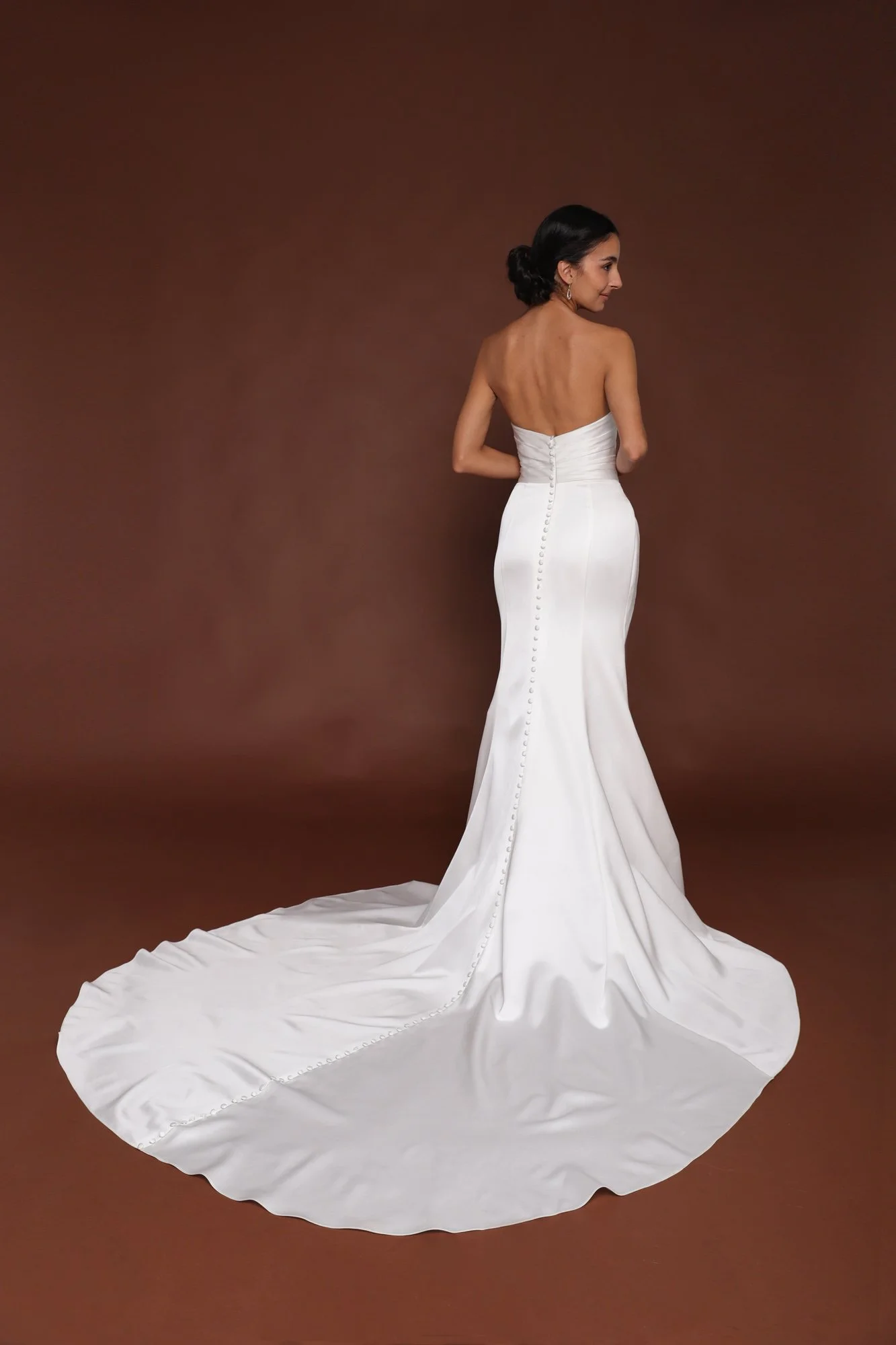 Strapless Charmeuse slim fitted wedding gown with asymmetrical draped bodice, slit, and buttons to the end of the cathedral train.