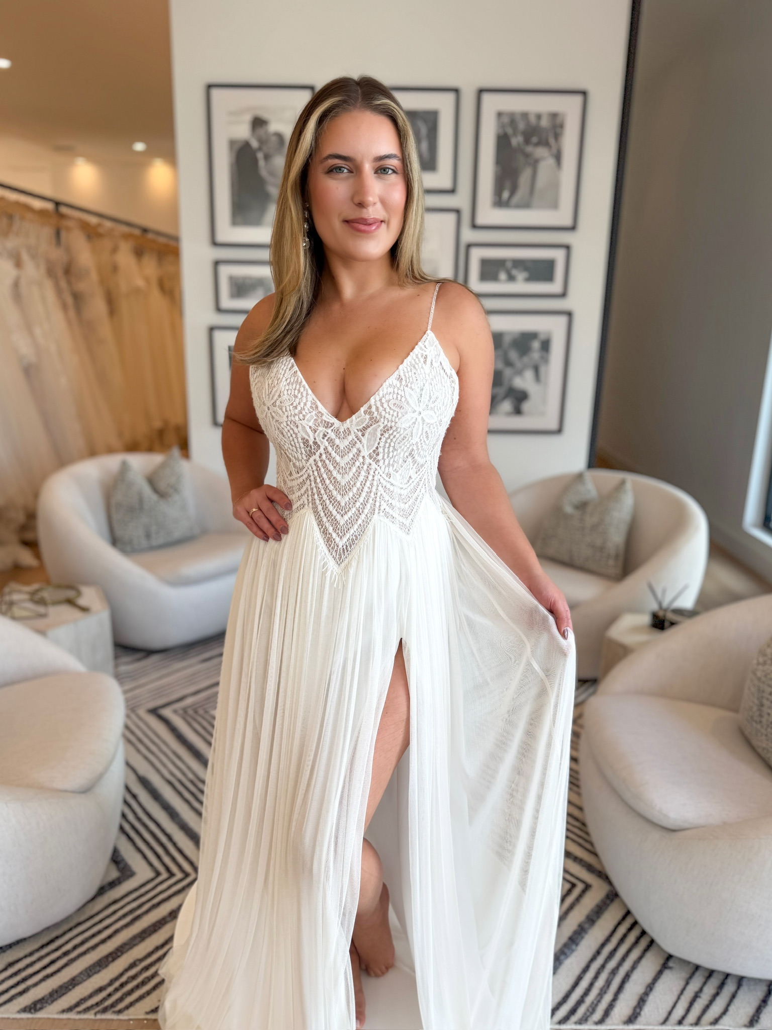A romantic A-line wedding gown featuring the classic FLORA back dip, Holly has a signature detail that creates a sought-after, fashion-forward silhouette. Elegant, timeless, and effortlessly feminine, the Holly is designed for the bride who radiates confidence and grace.