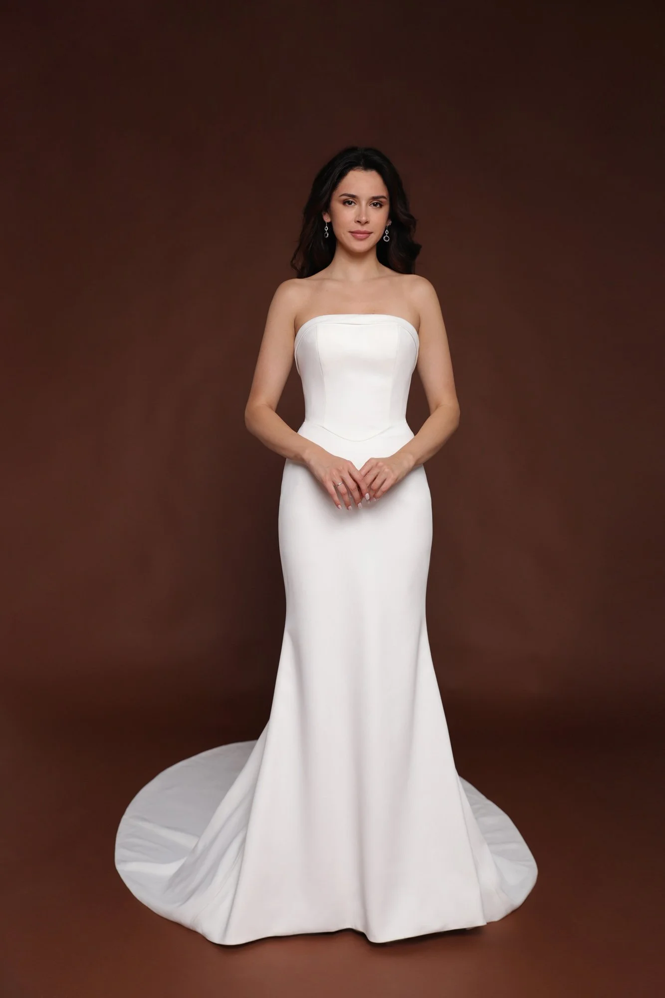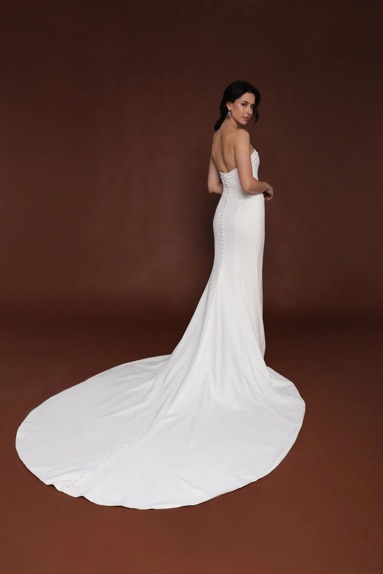 Hummingbird features a stunning strapless cuff neckline and dainty basque waist in a beautful structured crepe fabric. Hummingbird has a mermaid fit with buttons to the end of the chapel train. For the classic and timeless bride who wants a modern feel.