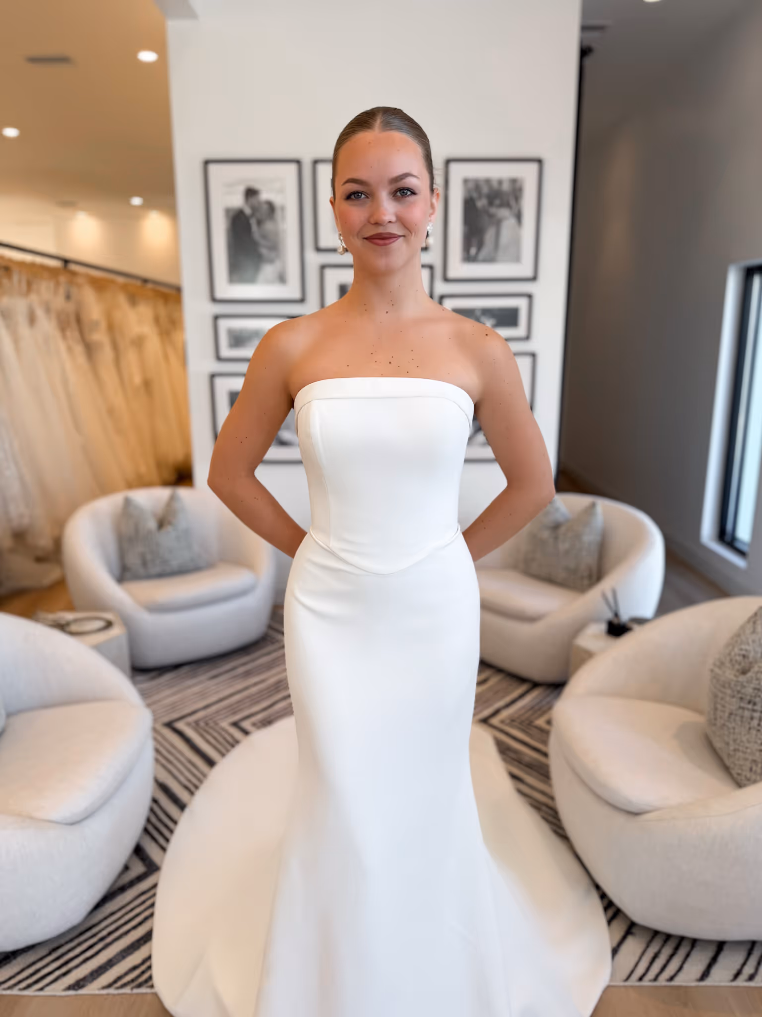 Hummingbird features a stunning strapless cuff neckline and a delicate Basque waist, crafted in beautifully structured Crepe for a sleek, elegant silhouette. The gown hugs the body in a mermaid fit, flowing into a chapel-length train adorned with covered buttons that extend to the end. Perfect for the classic and timeless bride who desires a modern, sophisticated feel with effortless elegance.
