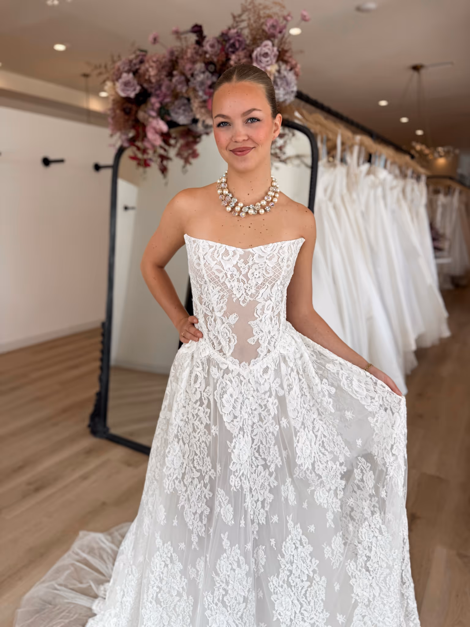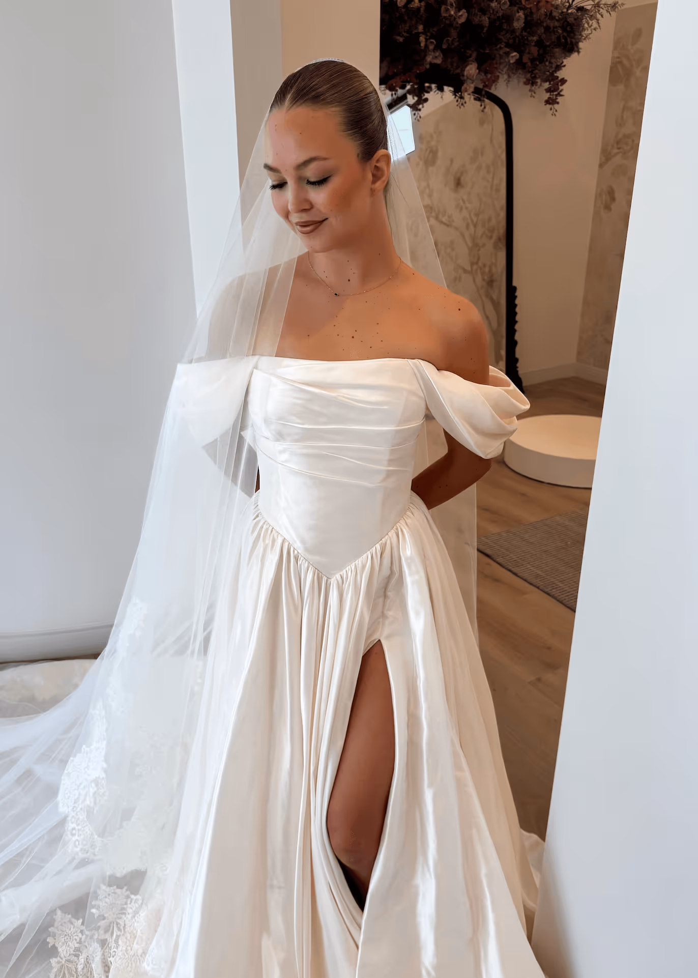 This wedding dress is ready-to-wear and available exclusively off the rack for purchase. Inez by Sarah Seven is a stunning sheath wedding gown with a corseted bodice. This gown features a chic high side slit in the skirt. A classic look with a modern touch. Comfortable yet elevated. Available in a size 8.