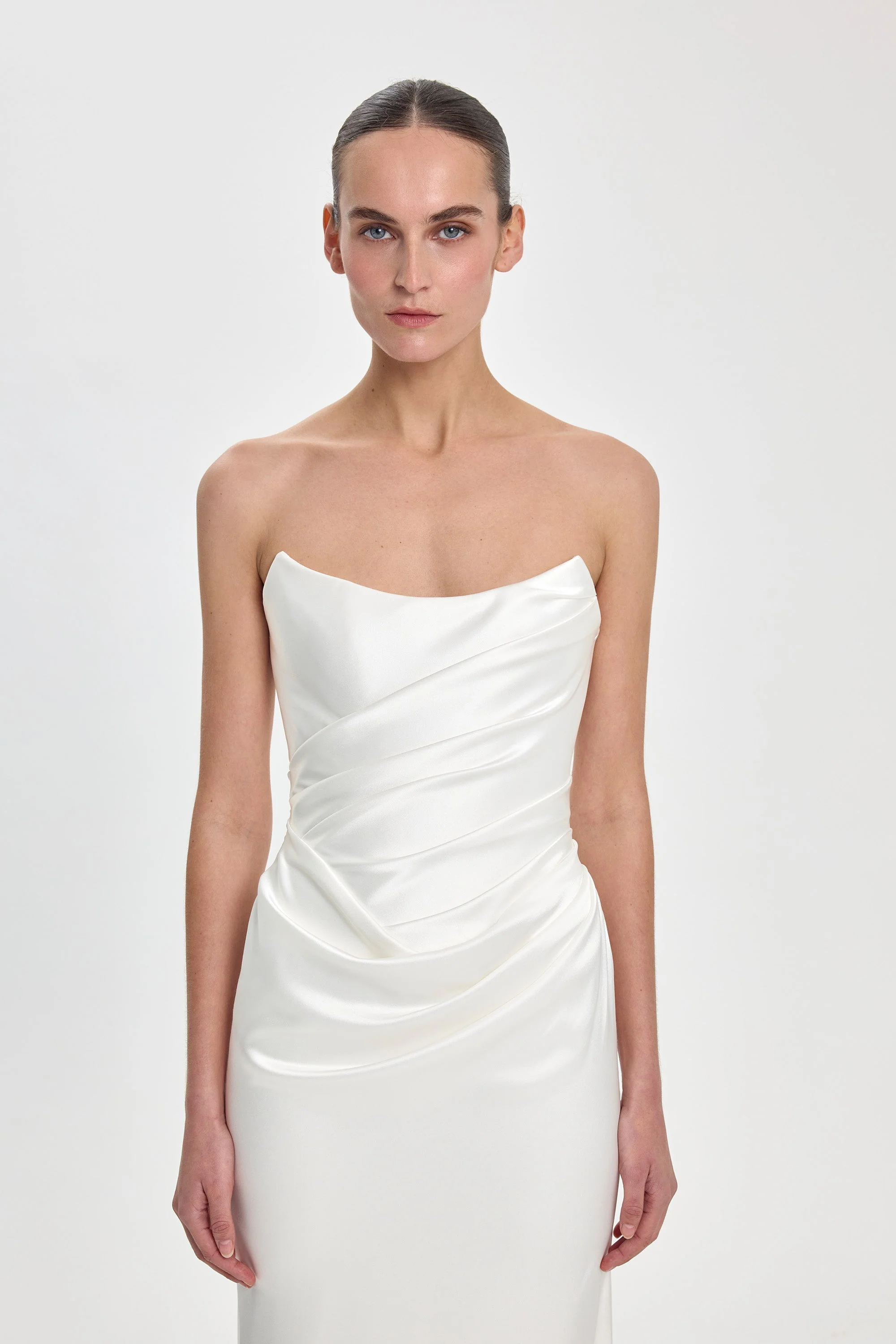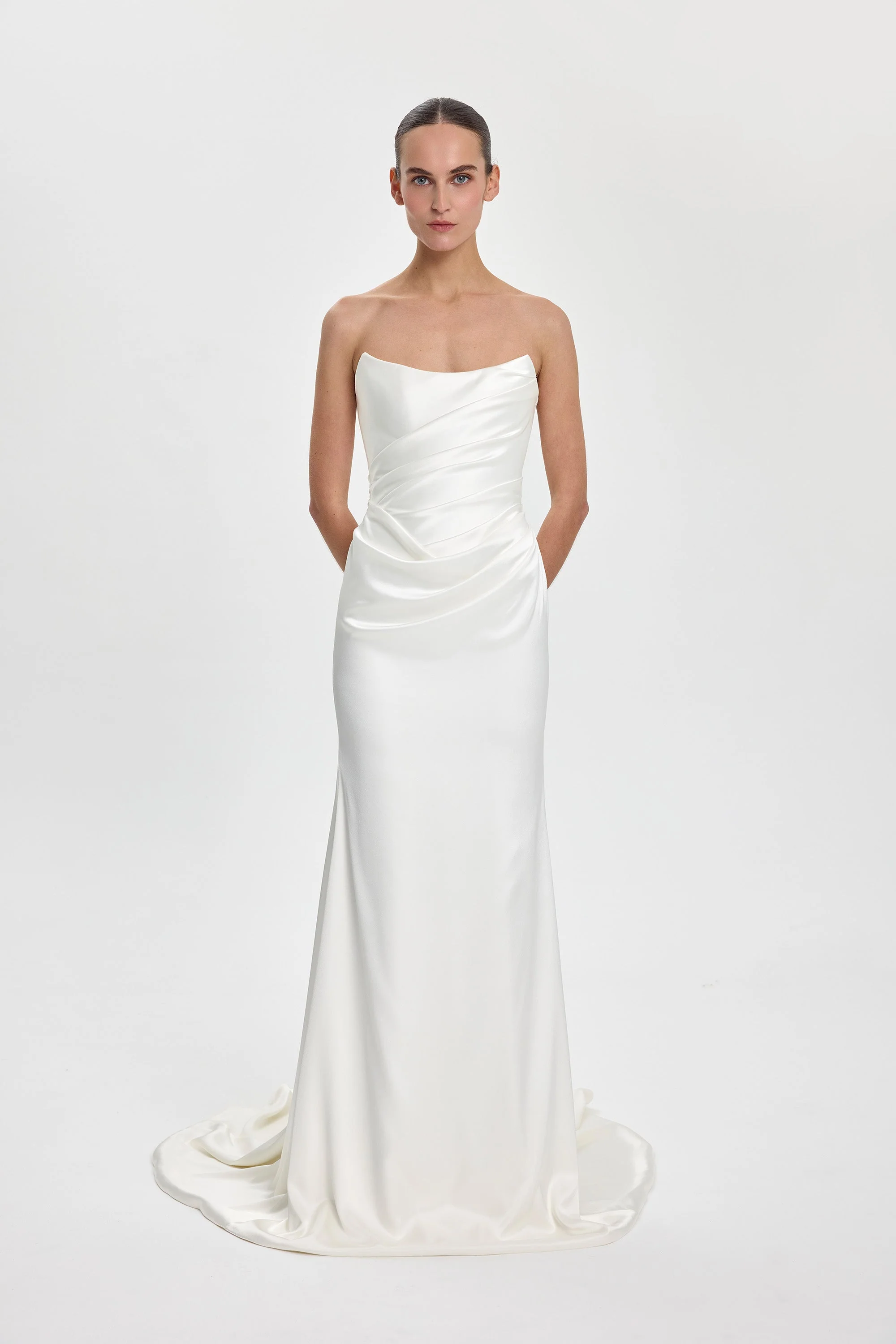 Iver is an instant icon! A structured, scoop neckline bodice cinches the waistline and a slim sheath skirt celebrates and highlights the female form. But the star of the show for Iver is its draping. Tight and directional across the bodice and relaxed at the waistline for maximum coverage and impact. Modern yet timeless, Iver can be paired with a lace veil for a truly incredible bridal moment.